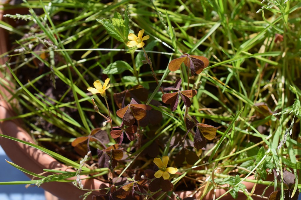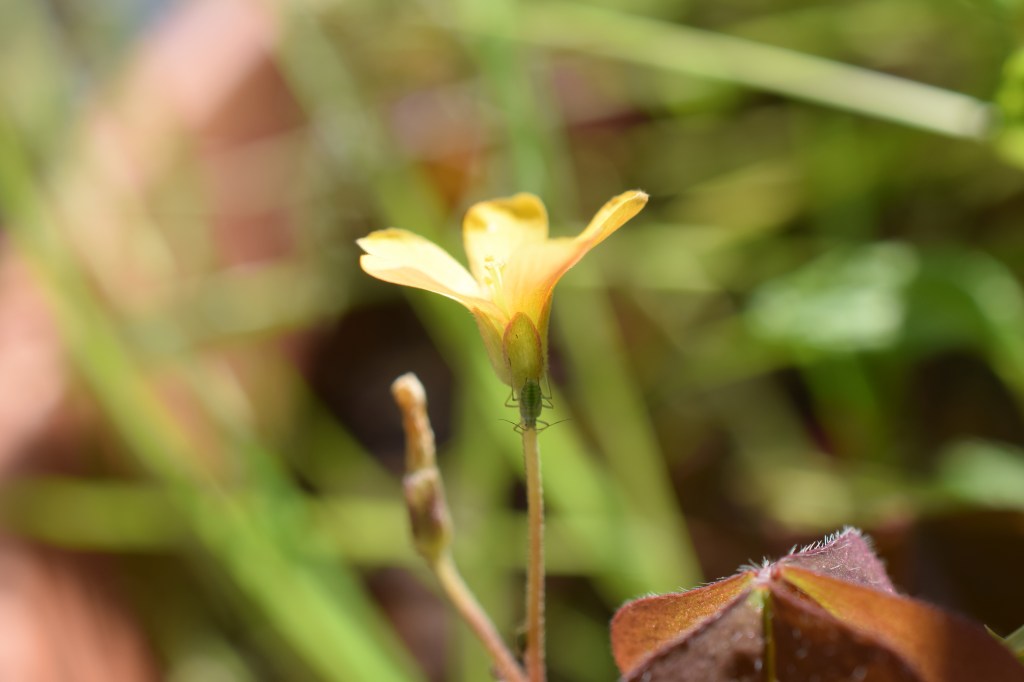 Pour le moment nous avons ce qui à première vue pourrait passer pour du trèfle ou de la luzerne à cause des feuilles à trois folioles, mais est en fait c’est complètement autre chose: l’oxalide corniculée, Oxalis corniculata. La famille des Oxalidaceae en France comprend seulement le genre Oxalis, on a vite fait le tour. Remarque, la photo du fruit a été prise une semaine plus tard. On notera aussi la présence d’un puceron, il y en a des centaines 😦