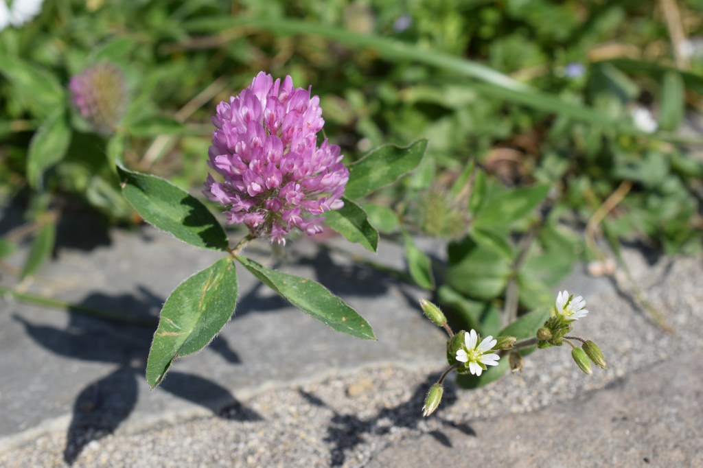 En marge d’une pelouse rigoureusement et réglementairement tondue, quelques manifestations de la nature décidément indomptable et c’est tant mieux. Ce joli bonbon rose c’est Trifolium pratense, la gourmandise des lapins. Famille des Fabaceae. Cette famille compte de nombreuses plantes fourragères comme la luzerne et aussi comestibles comme le pois, le haricot, la fève (Faba en latin qui donne Fabaceae).