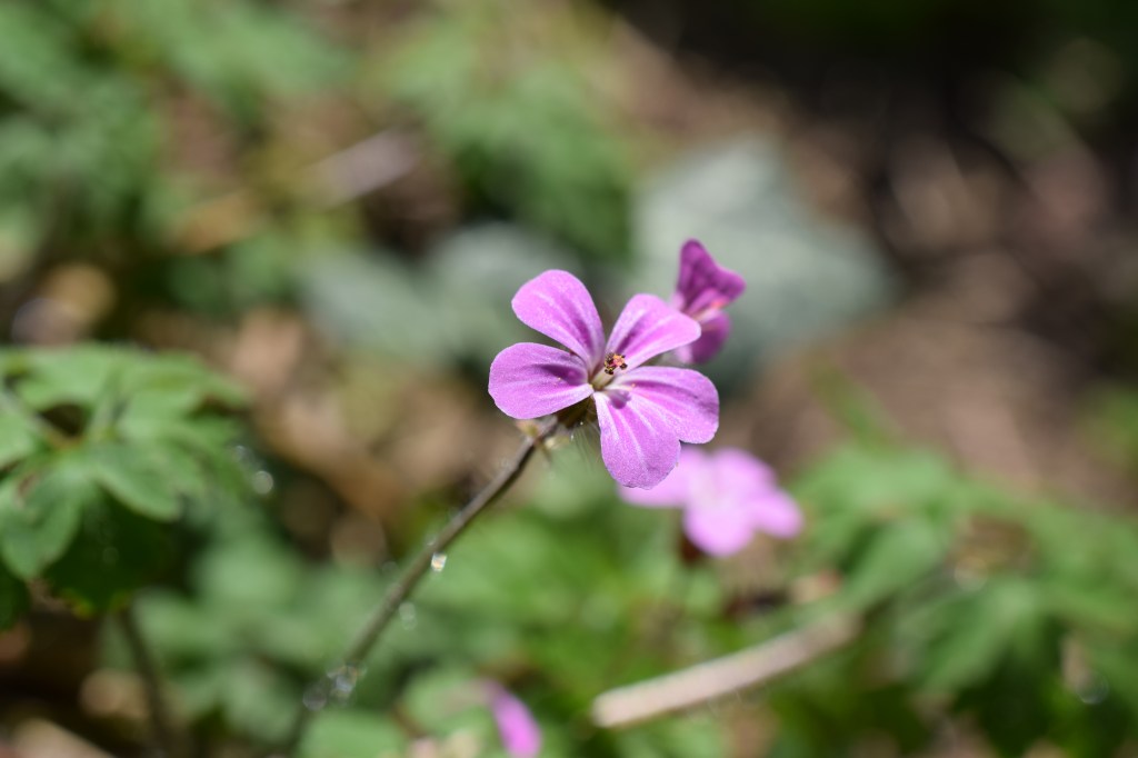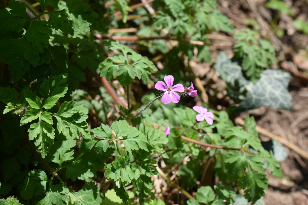 En bordure de sous-bois, le géranium herbe-à-robert. Qui est ce Robert? En fait il s’agit d’une déformation étymologique. On l’appelait herba rubea ou ruberta au Moyen âge du fait de la couleur souvent rougeâtre des tiges. « Ruberta » a donné Robert! Le plus drôle c’est que le nom scientifique actuel, Geranium robertianum, a pour ainsi dire officialisé cette confusion. Les Geranium sont parfois un peu compliqués à identifier mais celui-ci est facilement reconnaissable avec ses feuilles très découpées. Famille des Geraniaceae.