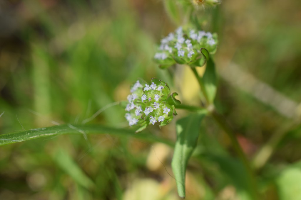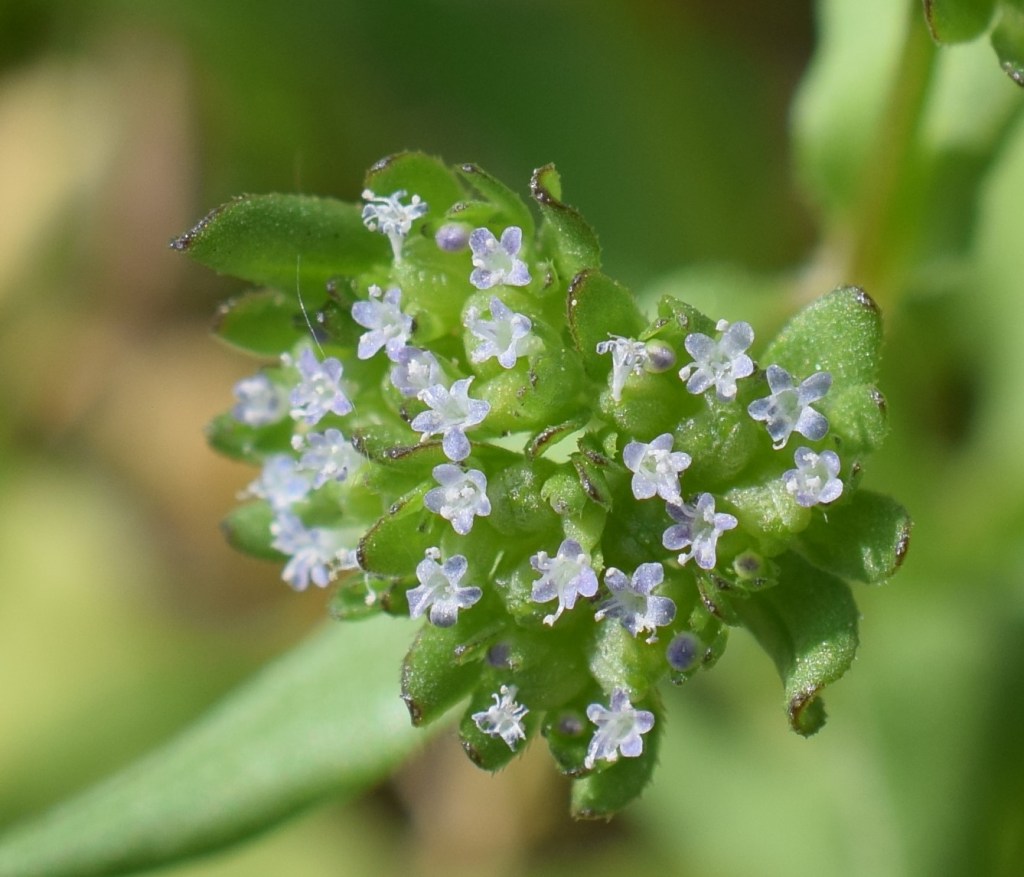 Cette très jolie mais très petite fleur est une valérianelle (petite valériane). La détermination de l’espèce nécessite en principe d’avoir les fruits, mais on ne les a pas, donc on reste sur Valerianella sp. Famille des Caprifoliaceae. Valerianella locusta est comestible, c’est la mâche dont on mange les jeunes feuilles en salade.