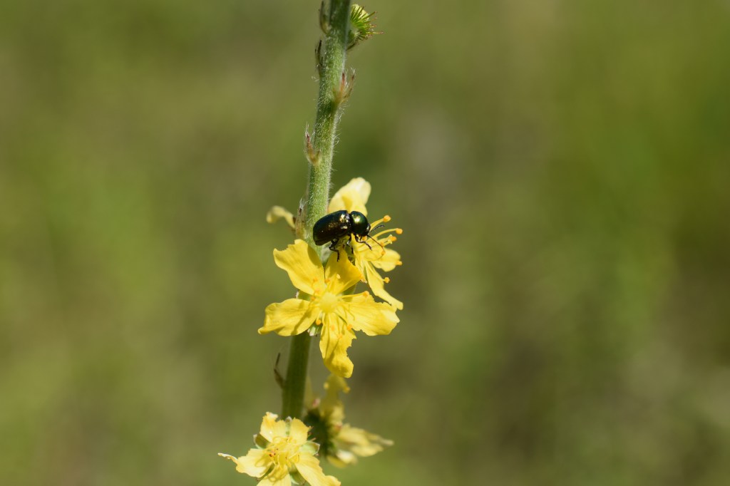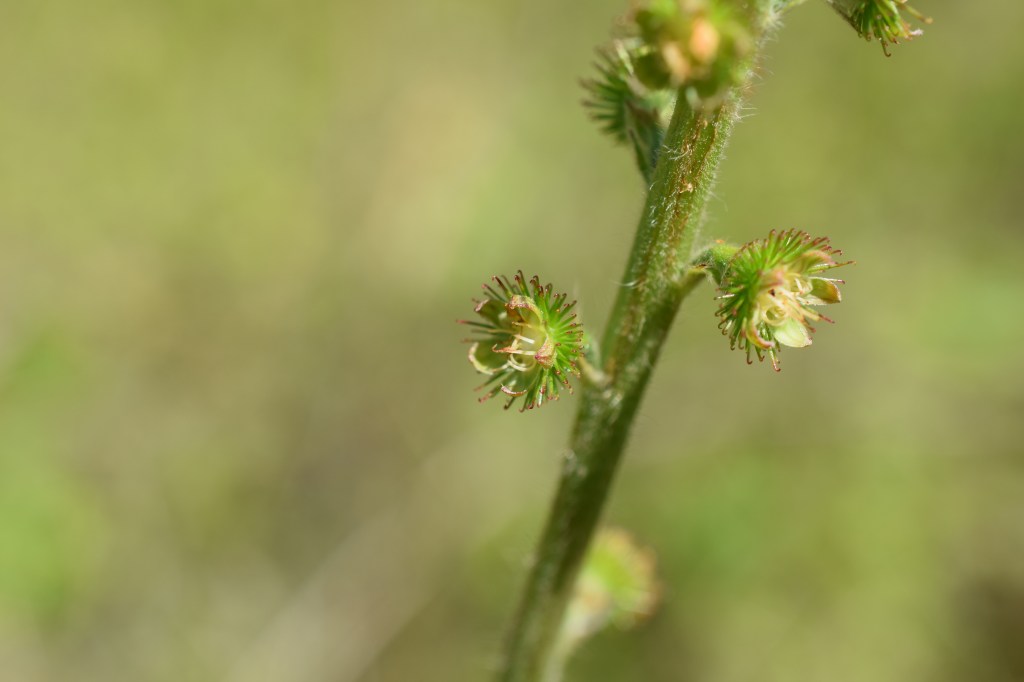 Agrimonia eupatoria, ROSACEAE. L’aigremoine eupatoire est très facilement reconnaissable à ses feuilles découpées en folioles de tailles inégales et à son inflorescence en long épi de fleurs jaune pâle. Le calice est pourvu sous les sépales d’un « hypanthium » (élargissement plus ou moins en coupe) qui grossit et se couvre de crochets à la fructification. Lesdits crochets se prennent dans les poils des animaux ou les vêtements des humains, assurant ainsi la dissémination de la plante suivant un procédé très répandu (zoochorie).