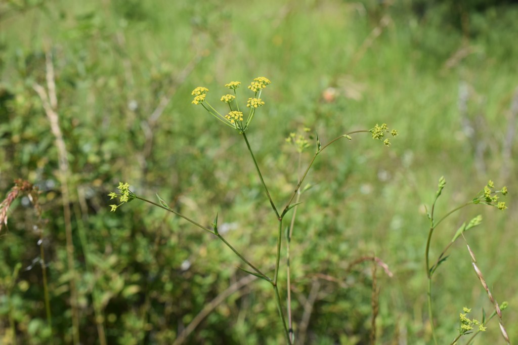 Bupleurum falcatum, APIACEAE. Le buplèvre en faux est une apiacée (ou ombellifère dans la nomenclature traditionnelle) relativement facile à identifier à ce que ses feuilles sont entières alors que beaucoup de plantes de cette famille ont des fleurs très découpées à l’instar du persil ou de la carotte.
