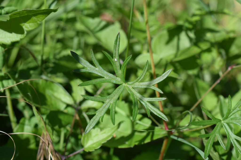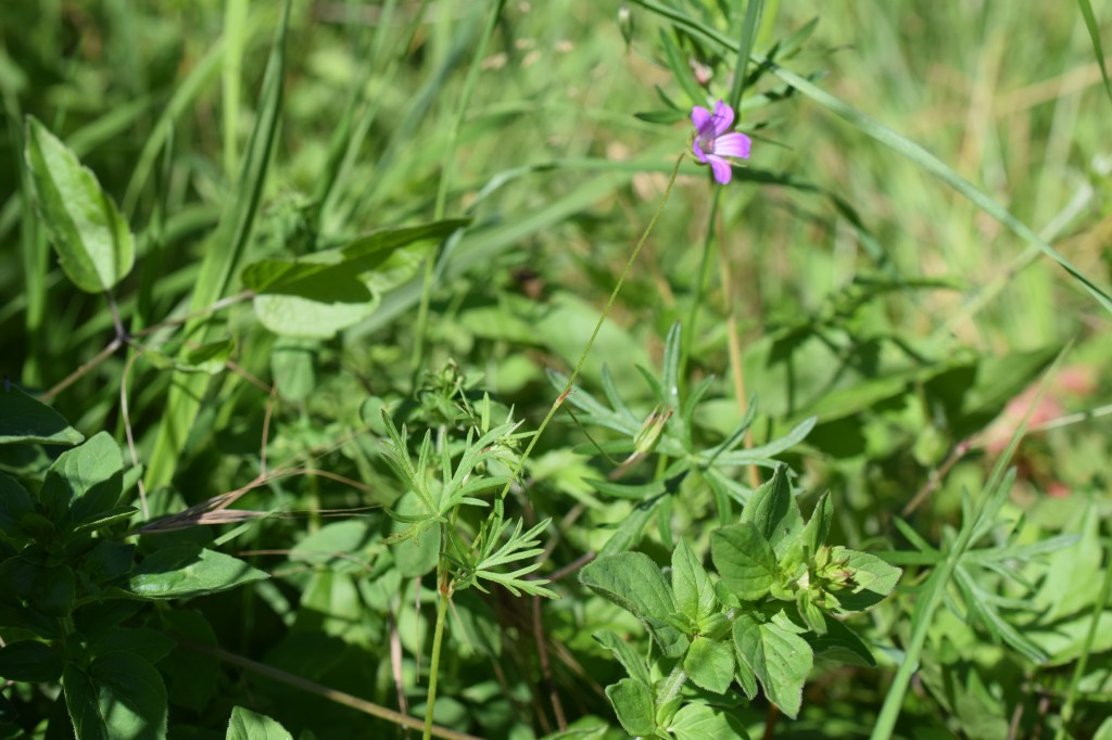 Geranium dissectum, GERANIACEAE. Le géranium disséqué est reconnaissable à ses feuilles découpées en lanières. Les fleurs sont discrètes, les pétales pas plus longs que les sépales.