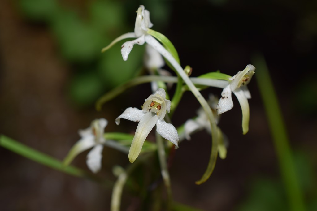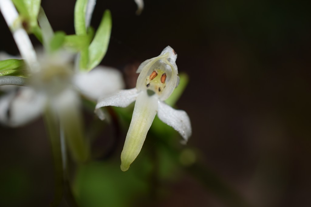 Plathantera chlorantha, ORCHIDACEAE. Encore une orchidée, (joie!), cachée à l’ombre des buissons, l’orchis des montagnes que l’on trouve un peu partout en France et pas seulement en montagne. Elle est reconnaissable à son très long éperon. Celui-ci contient du nectar tout au fond, que les papillons ou autres insectes à longue trompe sont en mesure d’atteindre, pollinisant au passage la fleur. La fleur vue de près est remarquable, on dirait un masque étrange qui nous regarde…