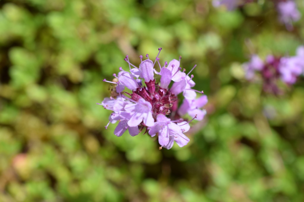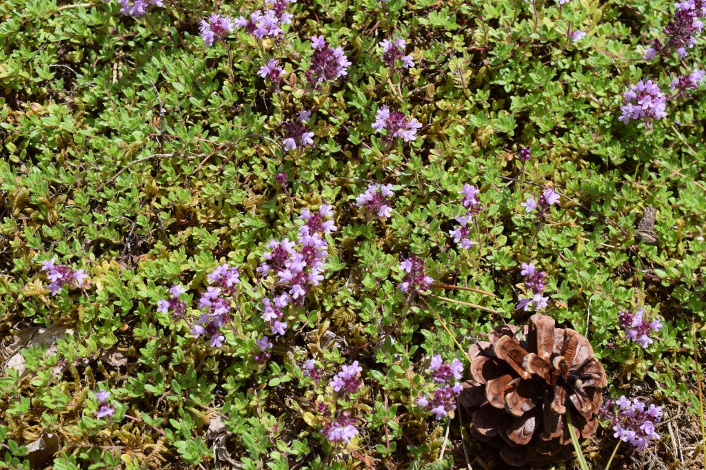 Thymus serpyllum, LAMIACEAE. Le thym serpolet est également une plante de terrain sec et ensoleillé, comme ma prairie où il fait décidément très chaud. Malgré son nom qui fleure bon le midi, on le trouve en fait presque partout en France. Mais froissez ses feuilles, respirez et… c’est déjà le sud!