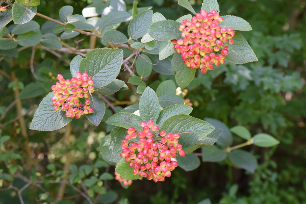 Viburnum lantana, CAPRIFOLIACEAE. La viorne lantane est un arbuste qui produit des fleurs blanches en corymbes très denses au printemps, qui deviennent des baies rouges puis noires à maturité. Il est très décoratif mais les baies ne sont pas comestibles.