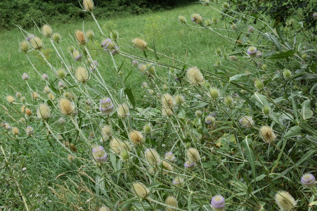 Le cardère sauvage, Dipsacus fullonum, Dipsacaceae est une plante imposante (elle peut atteindre 2 mètres) et intimidante avec toutes ses épines. La variété cultivée, Dipsacus sativus, le cardère à foulon (oui c’est un peu confus!) était utilisé pour carder la laine: les capitules secs, garnis de longues épines comme on peut le voir, étaient enfilés sur les peignes à carder. Le cardère sauvage porte aussi le joli nom de cabaret des oiseaux, car ses feuilles amplexicaules (qui se rejoignent au niveau de la tige) conservent longtemps l’eau après les averses.