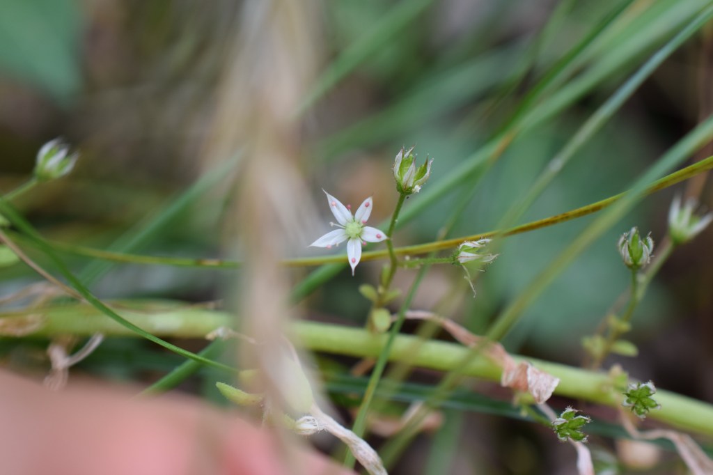 L’orpin paniculé, Sedum cepaea, appartient à la famille des Crassulaceae. C’est une famille de plantes souvent succulentes (ce qui ne veut pas dire qu’elles sont forcément bonnes à manger, mais qu’elles stockent de l’eau dans leurs organes végétatifs), mais ce n’est pas le cas de Sedum cepaea. Dans le cas de celle-ci, c’est plutôt l’aspect général de la fleur, en étoile avec ses pétales pourvus d’une fine arête, et les carpelles séparés, qui m’ont mise sur la piste de la famille…