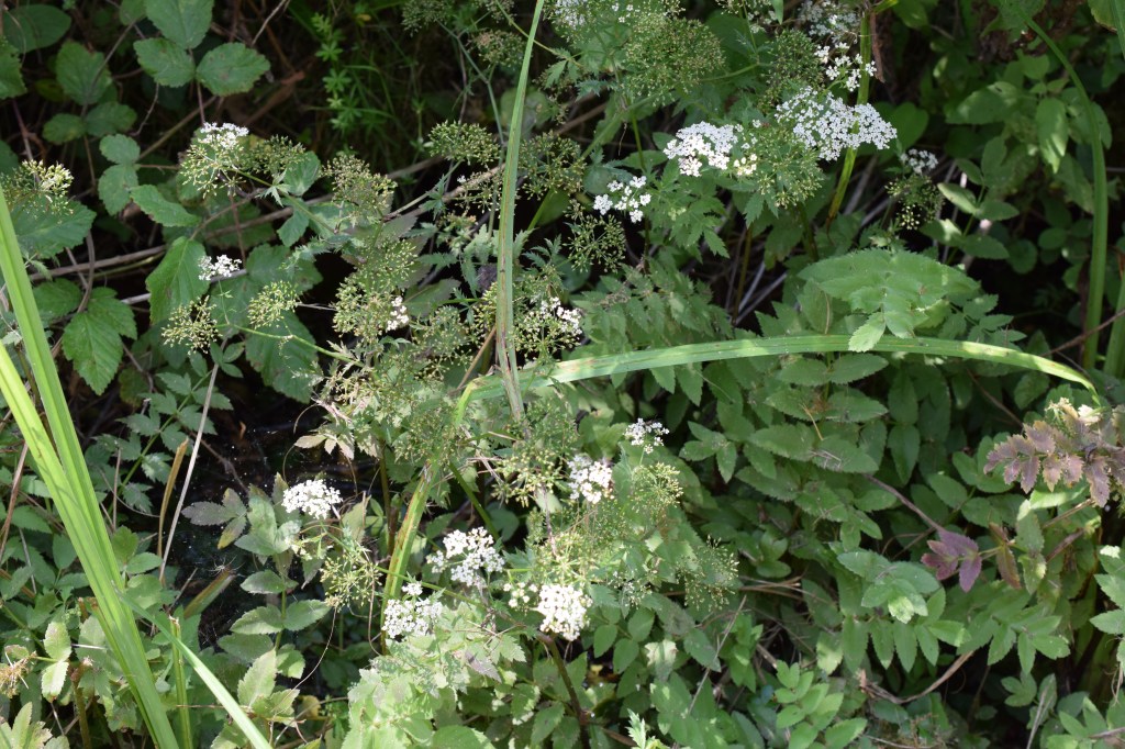 Berula erecta (Sium angustifolium dans la flore de Coste), Apiaceae, la Berle dressée, habite les cours d’eau, du coup, comme pour les nymphéas, pas facile de la photographier à moins de prendre un bain par la même occasion. Ses feuilles pennatiséquées, à folioles irrégulièrement dentées, sont assez caractéristiques, à condition de les repérer dans le fouillis de plantes entremêlées.