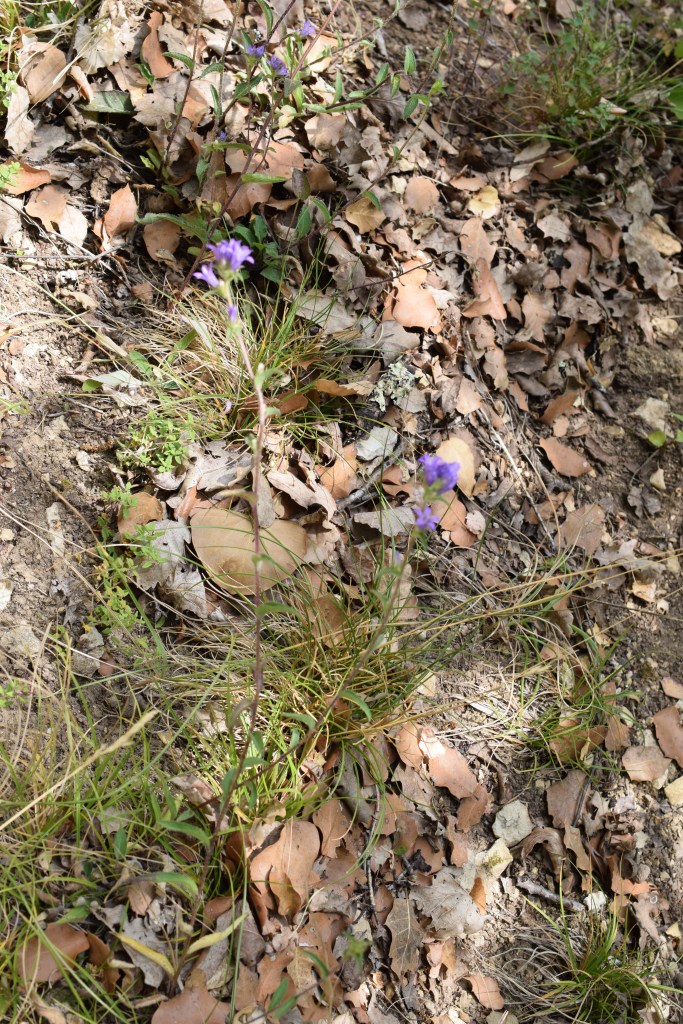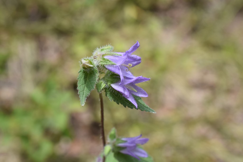 Campanula trachelium, la campanule gantelée, se distingue de la précédente par une inflorescence en épi (les fleurs ne sont pas groupées mais réparties le long de la tige) et des feuilles basales nettement en coeur. Famille des Campanulaceae. J’aime bien trouver plusieurs représentants du même genre dans la même ballade.