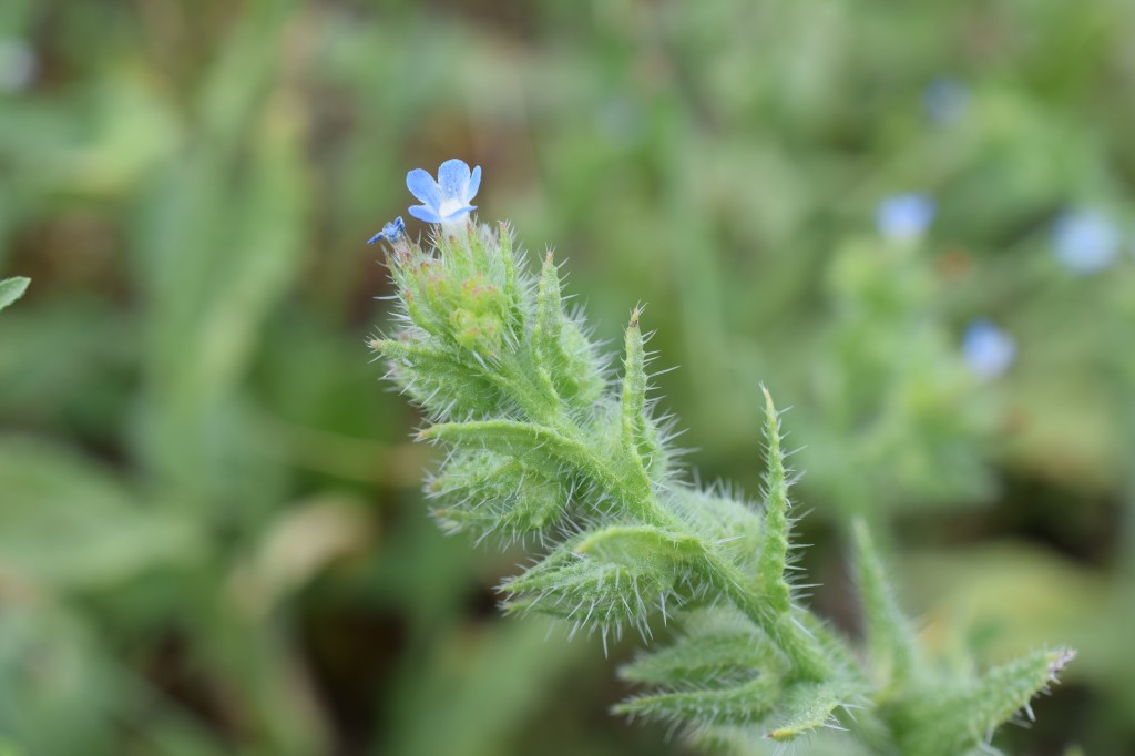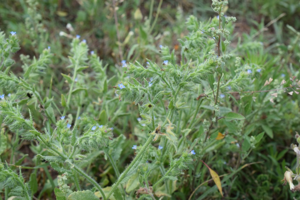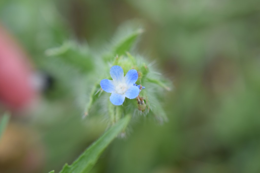 Lycopsis arvensis, la Buglosse des champs, est une plante toute hérissée de poils raides qui arbore de discrètes petites fleurs bleues. Famille des Borraginaceae.
