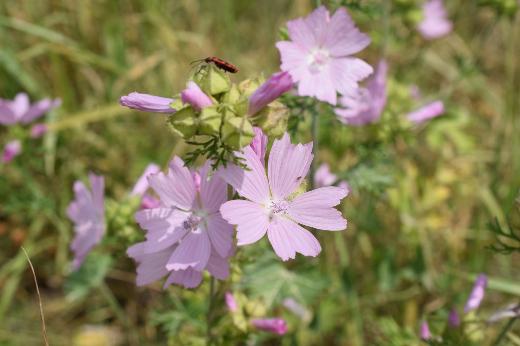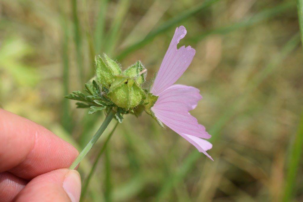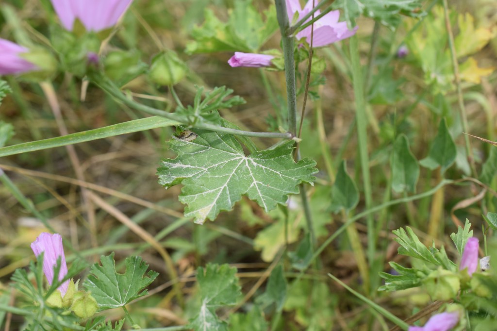 Malva moschata, la Mauve musquée, arbore de grandes et délicates fleurs roses, et des feuilles de deux sortes, les unes entières, les autres à l’inverse très découpées. Famille des Malvaceae.