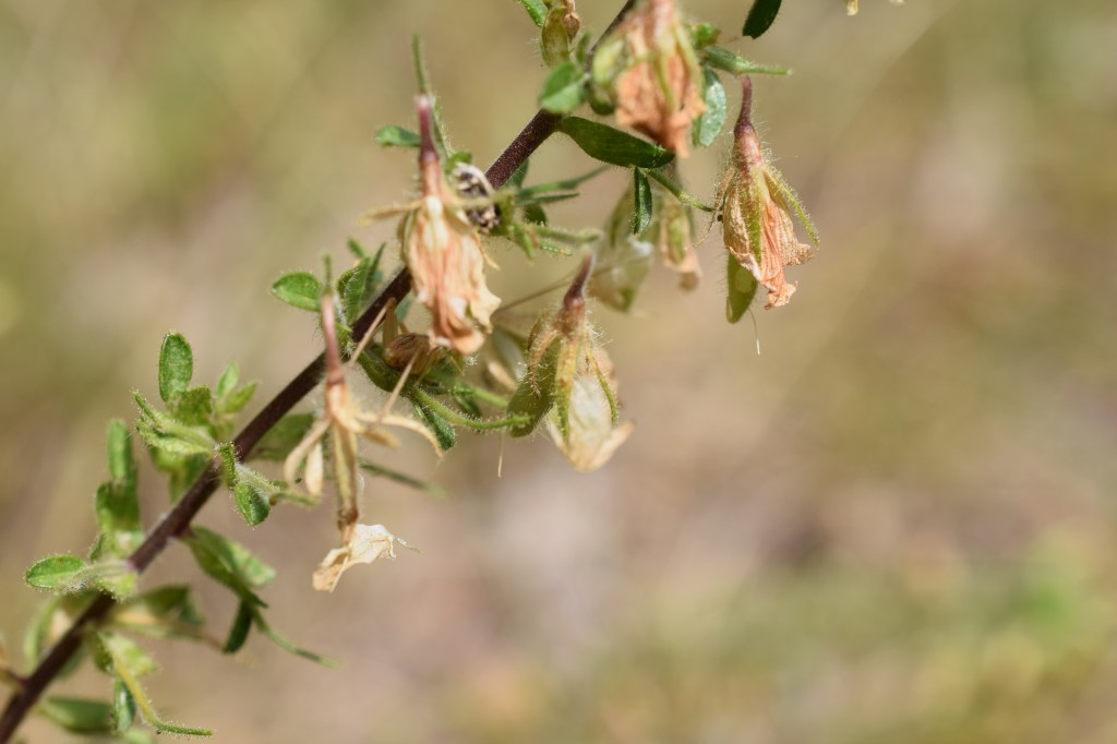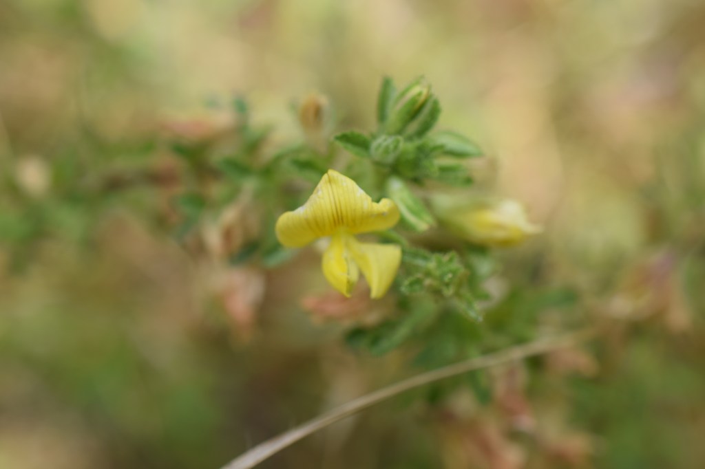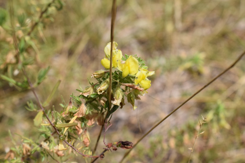 Ononis natrix, Fabaceae, se distingue par ses jolies fleurs jaunes finement veinées de pourpre. Elles sont un peu passées, mais cela permet d’observer les fruits en préparation: ce sont des gousses, caractéristiques des Fabaceae (famille du haricot).