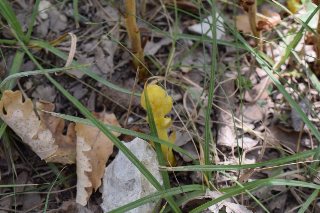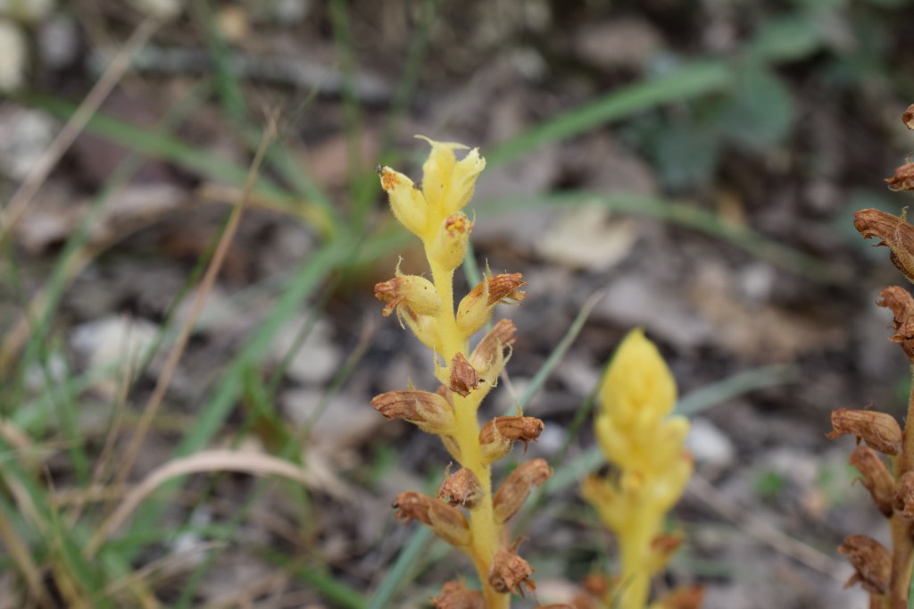 Cet étrange truc jaune est sans aucun doute une Orobanche, famille des Orobanchaceae. Les Orobanches sont des plantes parasites: la partie souterraine est munie de suçoirs qui s’implantent sur les racines de la plante hôte. C’est la raison pour laquelle elles n’ont pas de chlorophylle et ne sont donc pas vertes. Pour identifier une orobanche il faut vraiment se pencher dessus et noter, entre autres caractères subtils, le niveau d’implantation des étamines dans la corolle. Autant dire que dans le cadre d’une ballade en famille c’est fichu. Orobanche sp. donc.