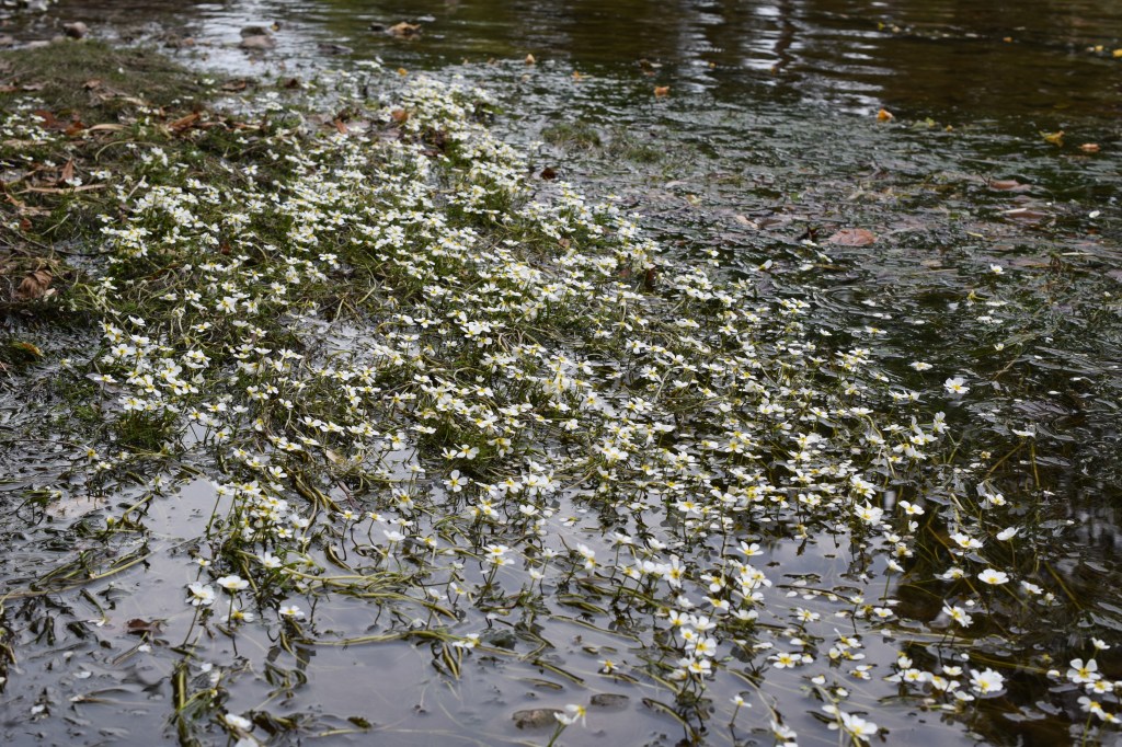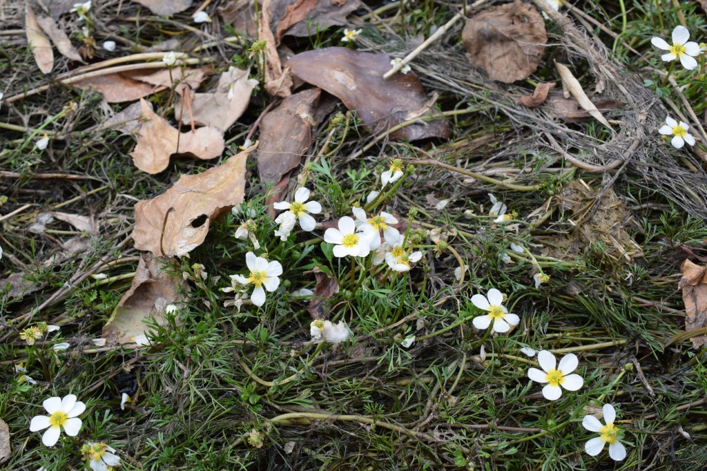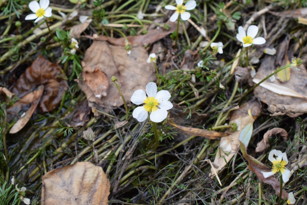 La renoncule aquatique, Ranunculus aquatilis, pousse comme son nom l’indique les pieds dans l’eau. Elle a des feuilles de deux sortes, les unes immergées découpées en lanières, les autres aériennes plus larges, à 3 lobes plus ou moins profonds. Les fleurs sont blanches, avec la base des pétales tachée de jaune. Famille des Renonculaceae.