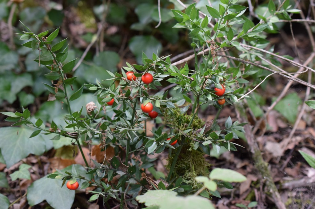 Le petit Fragon, Frugus aculeatus, arbore de jolies petites feuilles coriaces et piquantes et des baies rouges qui rappellent celles du houx. Les feuilles n’en sont pas vraiment: ce sont des « cladodes », des rameaux modifiés. Famille des Ruscaceae.