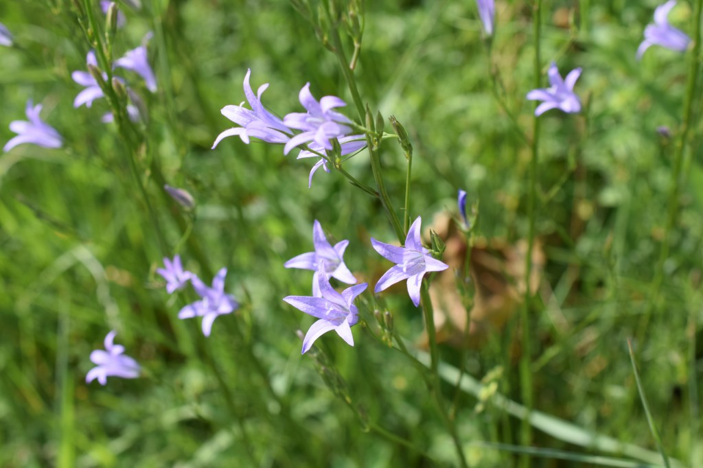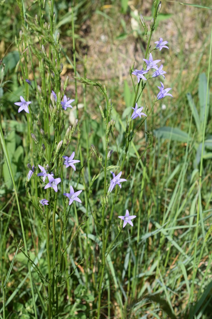 La campanule raiponce, Campanula rapunculus, a une tige dressée et raide, des feuilles petites et étroites et des fleurs en cloche avec des lobes profondément découpés. Famille des Campanulaceae.