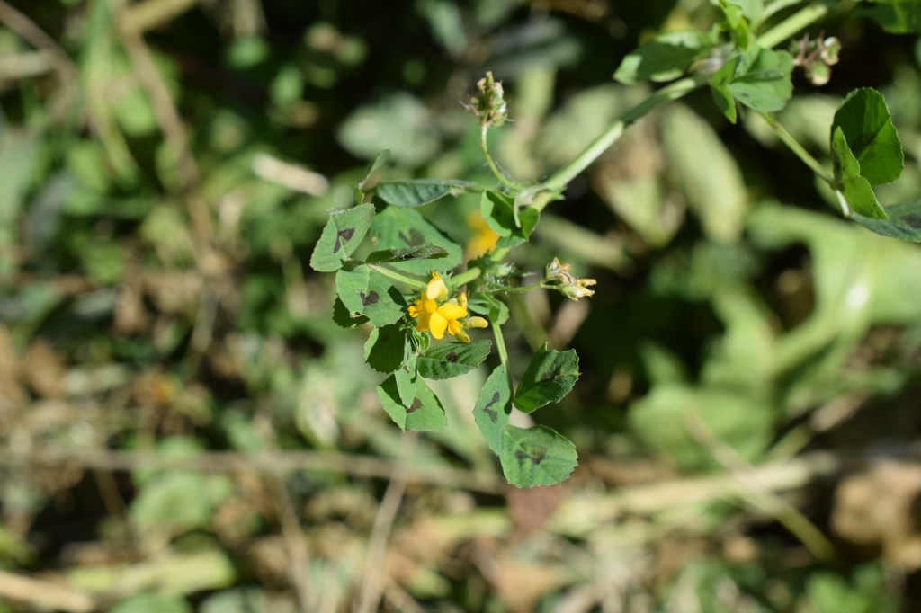 Medicago arabica, Fabaceae, la luzerne d’Arabie, présente ce genre de fruits très caractéristiques. Elle possède aussi des feuilles à trois folioles, comme toutes les luzernes, mais chaque foliole a aussi généralement une tache noirâtre.