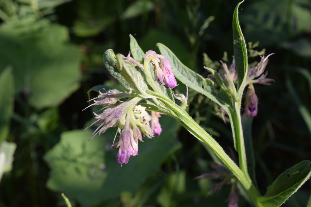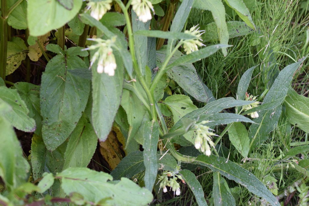 Symphytum officinale, Borraginaceae, a des feuilles longuement décurrentes, c’est-à-dire que le limbe se prolonge sur la tige qui donne ainsi l’impression d’être ailée. C’est une plante médicinale utilisée autrefois pour ses vertus cicatrisantes. Les fleurs sont le plus souvent d’un blanc jaunâtre mais parfois aussi se teintent de rose.