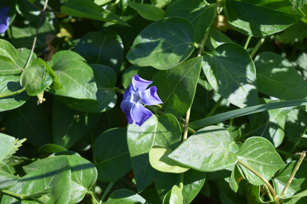 J’aime beaucoup les fleurs des pervenches dont la forme particulière rappelle un petit moulin à vent. Vinca major, la grande pervenche, se distingue de Vinca minor par des feuilles plus grandes à marge légèrement ciliée. Famille des Apocynaceae.