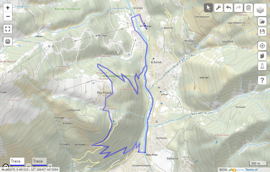 Pour cette première ballade, je suis partie du hameau du Fangeas altitude 1200 m, commune de Vallouise-Pelvoux. J’ai d’abord traversé le Gyr et longé la rive droite du torrent, puis je suis montée le long du versant, à travers la forêt, jusqu’à Puy Aillaud à 1600 m d’altitude. De là, je suis redescendue en direction du village de Vallouise, toujours dans une zone essentiellement arborée, sauf en bord de route. A Vallouise j’ai traversé de nouveau le Gyr pour remonter en direction du Fangeas par la rive gauche du torrent.