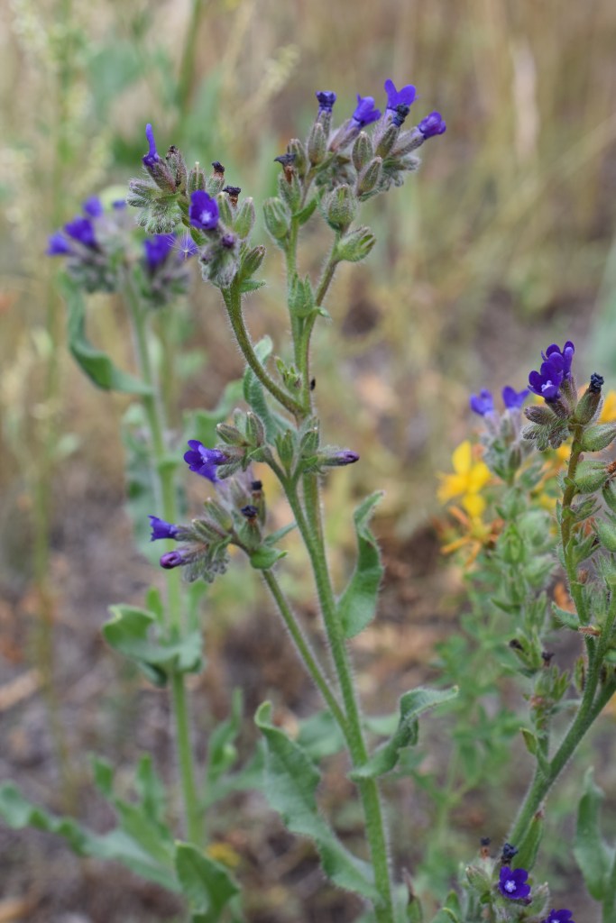 Anchusa officinalis, buglosse officinale, Borraginaceae. Pour le genre Anchusa: corolle munie de 5 écailles convergentes, à tube allongé et droit, comportant une partie plane bien développée, plantes hérissée de poils raides, calice à 5 divisions. Buglosse signifie « langue de boeuf », allez savoir pourquoi?
