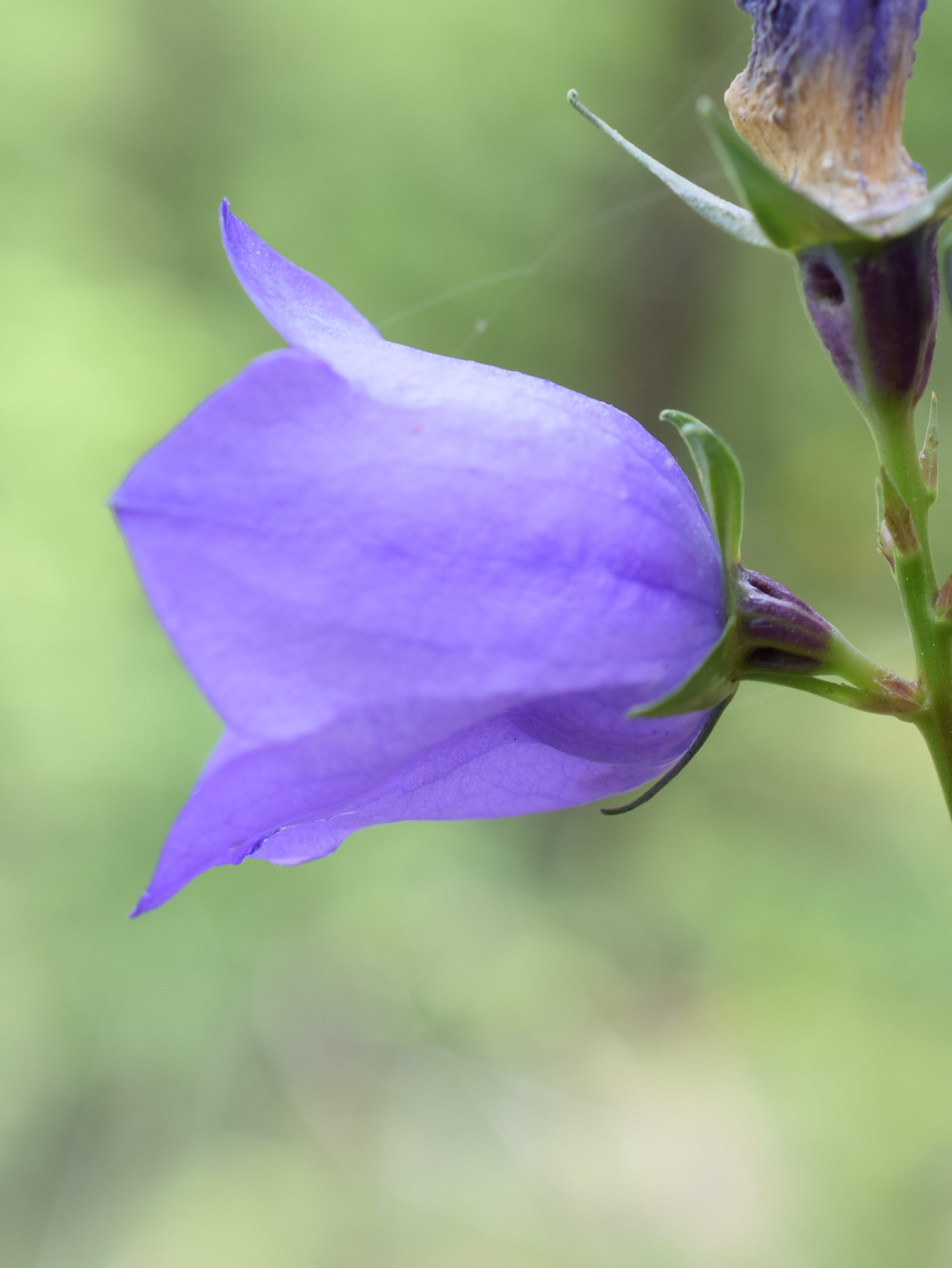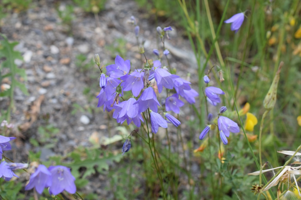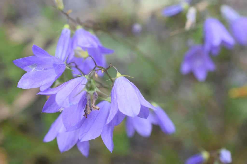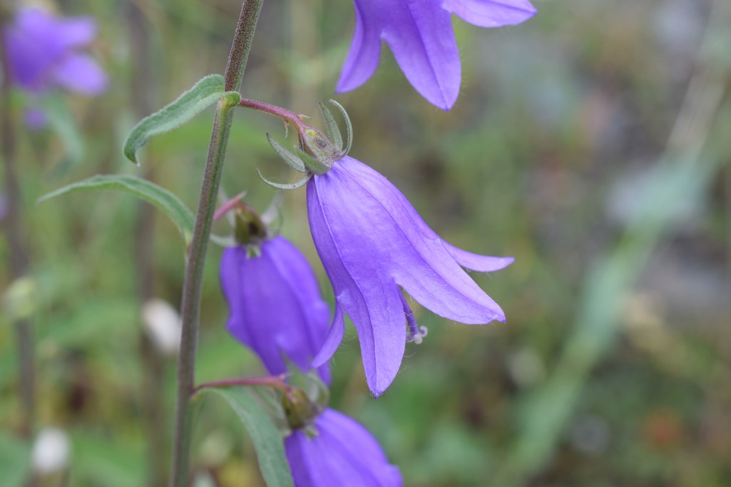 Campanula rotundifolia, comme son nom l’indique, est censée avoir des feuilles rondes sauf qu’il s’agit des feuilles de la base, et qu’elles sont généralement détruites lorsque la plante fleurit. Cela veut dire que pour arriver à l’espèce, on doit faire une « impasse » dans les clés de détermination: « feuilles radicales ovales ou suborbiculées »? On ne sait pas: on suit quand même, et on voit où ça nous mène… En l’occurrence, avec les feuilles caulinaires étroites, le calice à lobes linéaires, les tiges grêles et presque nues au sommet, la corolle largement campanulée et penchée, on est bien sur rotundifolia. Ou pas… Etant donné le caractère encore confidentiel de ce blog il n’y aura pas tellement de contestation avant un moment…