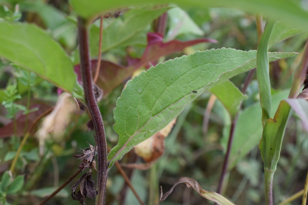 Nous quittons le sous-bois pour émerger dans les prés, au village de Puy Aillaud. Ballota nigra subsp. foetida, la ballote fétide, Lamiaceae, dégage une odeur puissante et désagréable au froissement. C’est nonobstant une belle plante, robuste, avec des feuilles fortement nervurées et un calice en coupe.