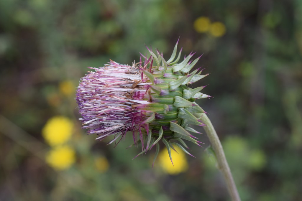 Carduus nigrescens, chardon noircissant, Asteraceae. Pour distinguer les genres Carduus et Cirsium: Cirsium a les poils de l’aigrette plumeux, pas Carduus. Celui-ci est une plante robuste, épineuse partout, avec des tiges et des feuilles aranéeuses. les bractées du capitule sont arquées.