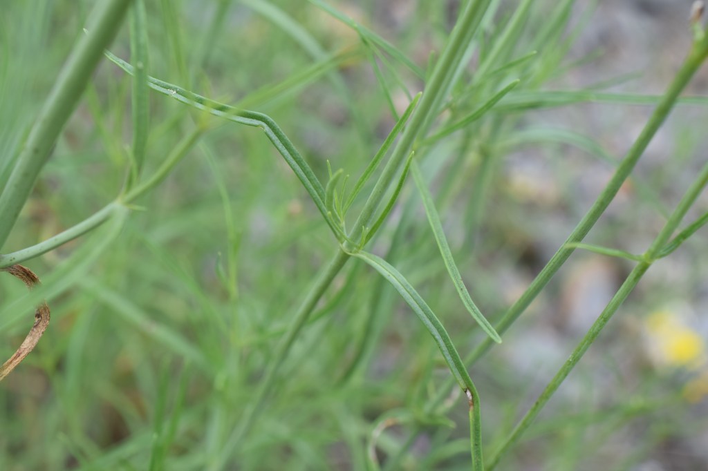 Lactuca perennis, laitue vivace, Asteraceae. La fleur ou plutôt l’inflorescence ressemble étonnamment à celle de Cichorium intybus, la chicorée sauvage. J’ai lu sur un site que le port et la forme des feuilles permettent de les distinguer. C’est encore plus simple, à mon avis, si l’on dispose des fruits: l’akène de Lactuca perennis est d’un beau noir luisant et surmonté d’un long bec qui supporte l’aigrette. Celui de Cichorium intybus est simplement surmonté d’une couronne d’écailles.
