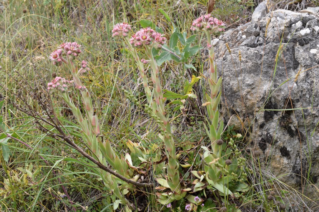 Sempervivum tectorum, Crassulaceae, la joubarbe des toits est une plante grasse caractéristique des pelouses rocailleuses. Ses pétales sont généralement roses avec une bande plus foncée au milieu, l’inflorescence est corymbiforme, les feuilles des rosettes basales assez larges > 8mm.