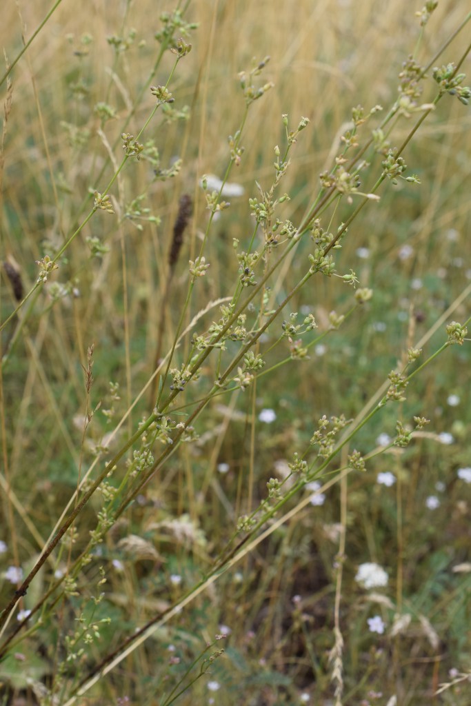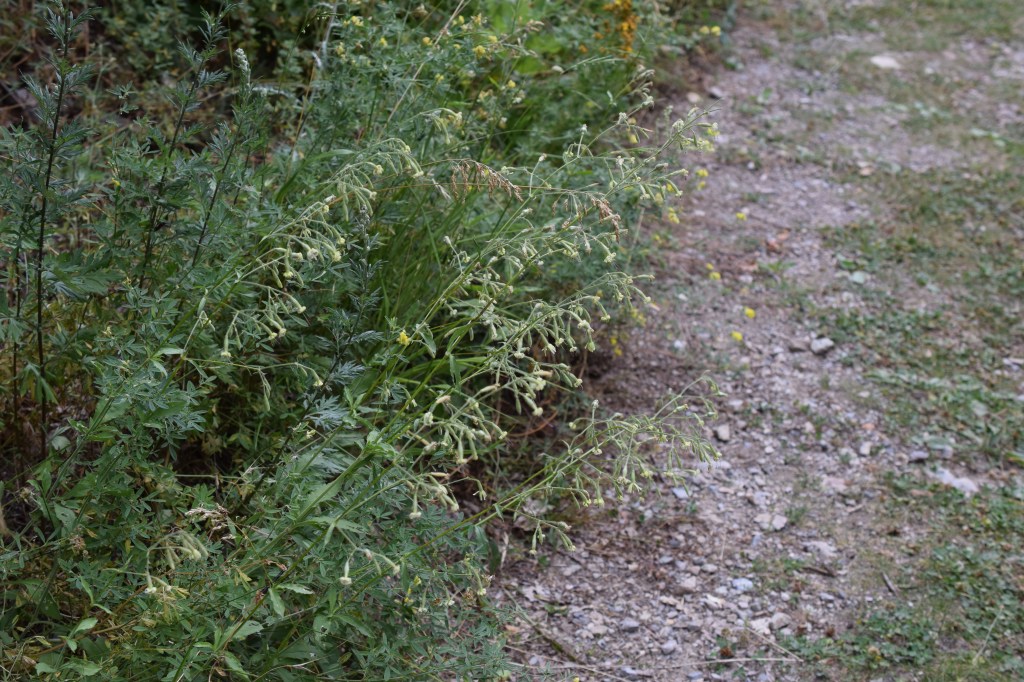 Celui-ci m’a donné du fil à retordre, pourtant une fois qu’on a trouvé, cela semble bien évident. Moment « bon sang mais c’est bien sûr » de la botanique… Les fleurs sont étonnantes, avec leurs pétales filiformes et leurs longues étamines, si bien que l’on ne sait plus très bien ce qu’on voit. Il s’agit pourtant d’une représentante un peu spéciale d’un genre ultra répandu, Silene, d’une famille bien commune, les Caryophyllaceae. Silene otites, le silène cure-oreilles.