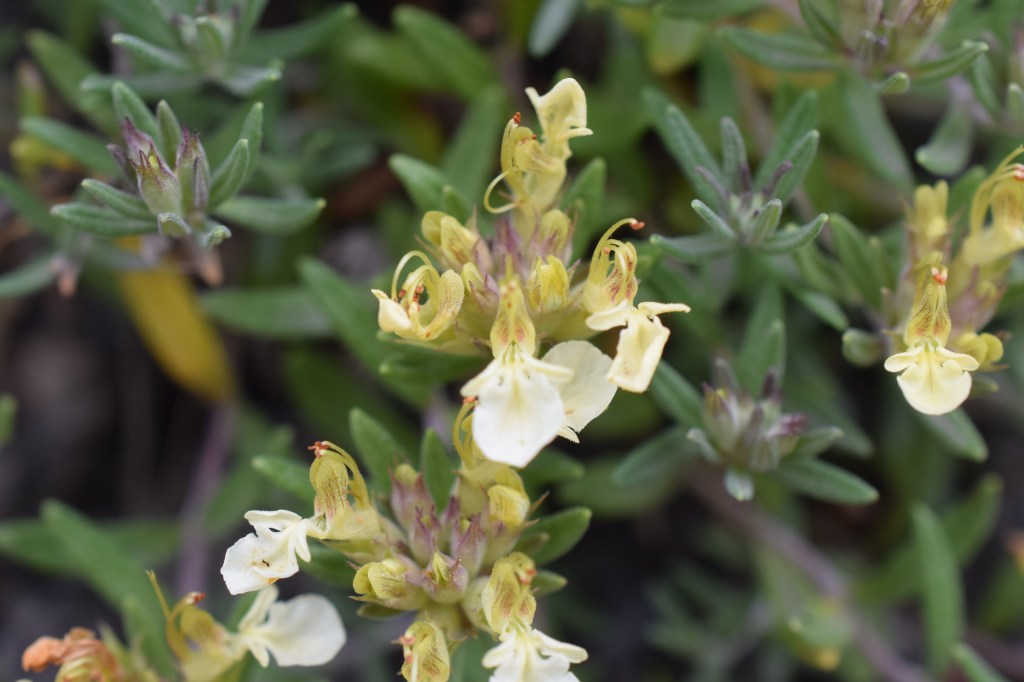 Teucrium montanum, la germandrée des montagnes, Lamiaceae. Pour le genre Teucrium, c’est assez facile: les fleurs sont très caractéristiques, avec l’absence de lèvre supérieure. Le seul autre genre, dans les Lamiaceae, à avoir adopté cette curieuse conformation, est Ajuga.