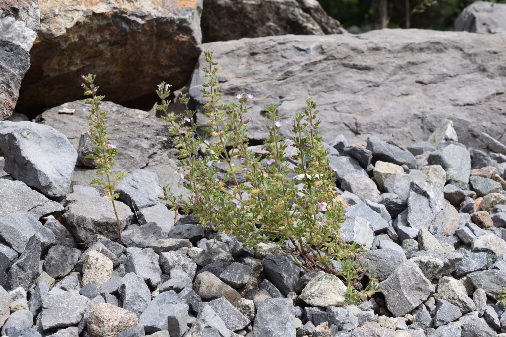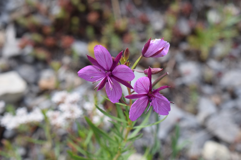 Epilobium dodonaei subsp. fleischeri, l’épilobe des moraines, Onagraceae. Se distingue de son proche parent l’épilobe à feuilles de romarin par ses feuilles légèrement dentées et une moins grande taille. Comme son nom l’indique il se développe au milieu des cailloux… Tous les goûts sont dans la nature. J’aime beaucoup les fleurs bicolores des épilobes…