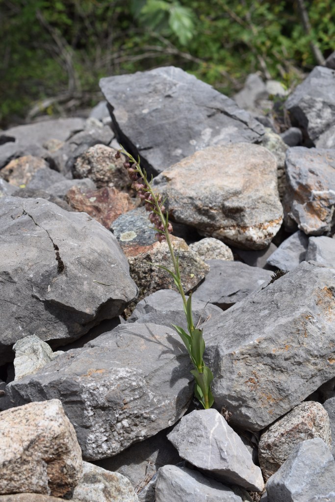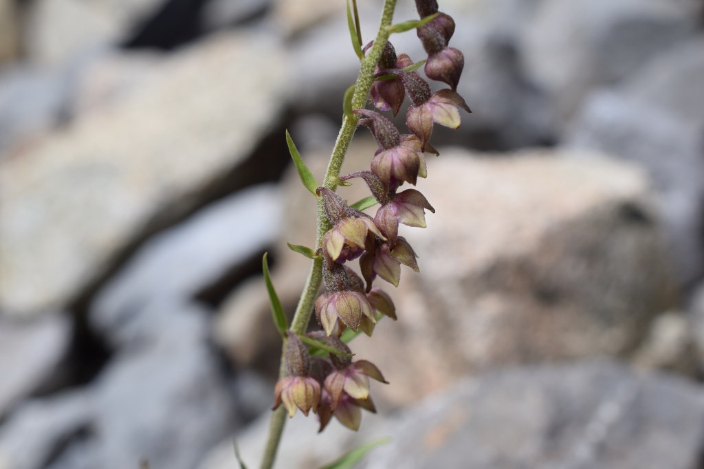 Cette Epipactis atrorubens, épipactis rouge sombre, Orchidaceae, a poussé en plein milieu d’un éboulis! Elle se distingue de sa cousine helléborine par une pilosité plus importantes, une couleur rouge sombre, des bourrelets sur le labelle et des feuilles plus allongées. Et aussi, elle n’a pas peur du soleil!