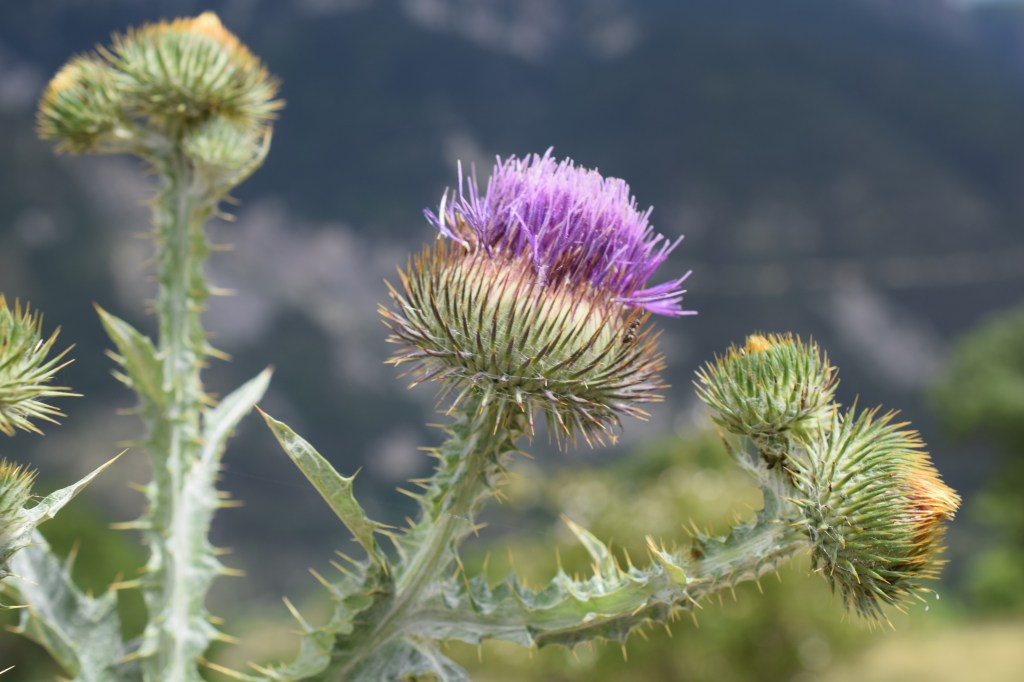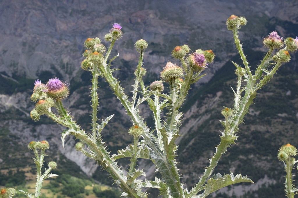 Un beau « chardon », Onopordum acanthium, Asteraceae, l’onopordon à feuilles d’acanthe. Il est très robuste, pourvu d’une tige ailée hérissée d’épines, et de gros capitules également bien bardés de piquants.