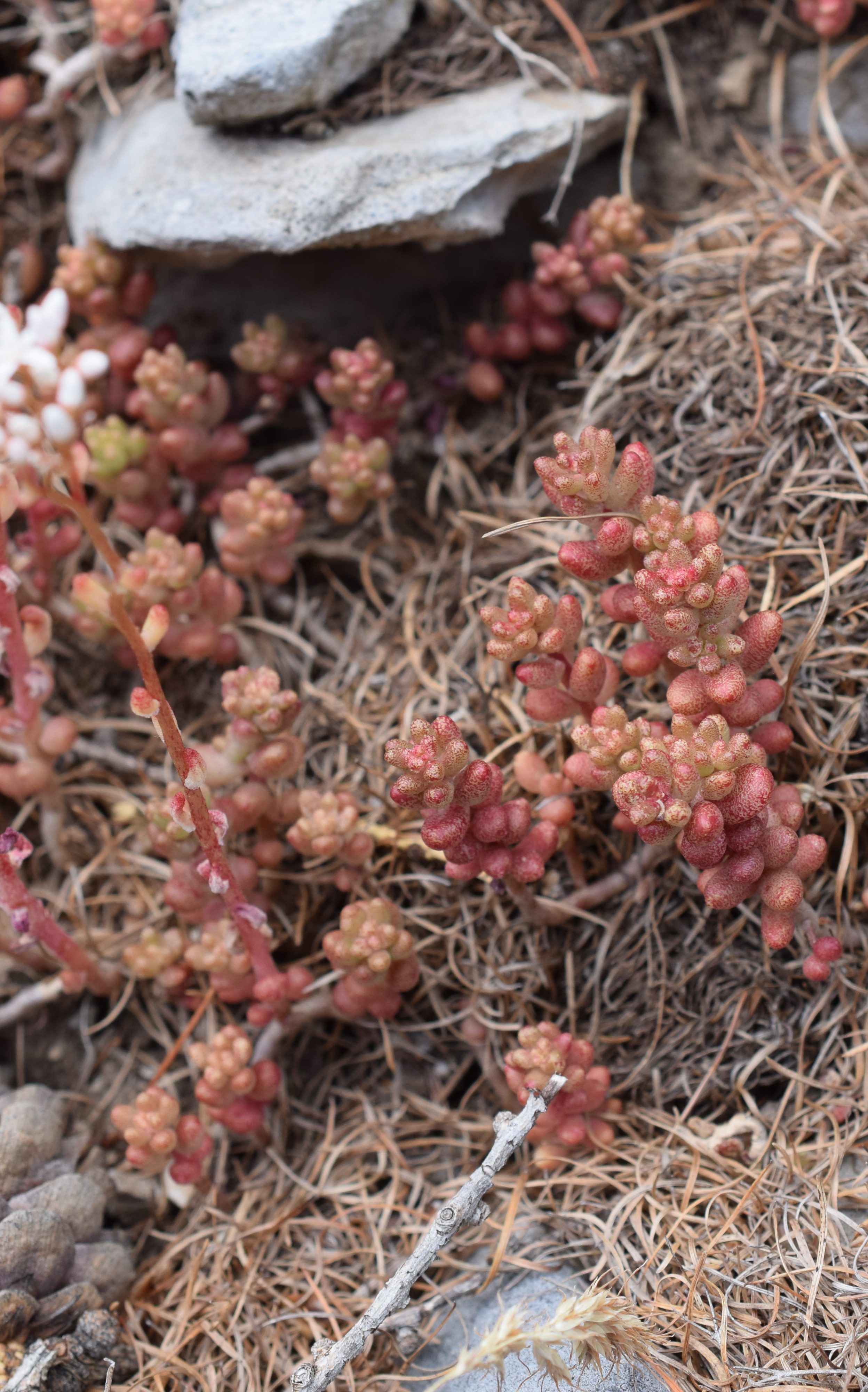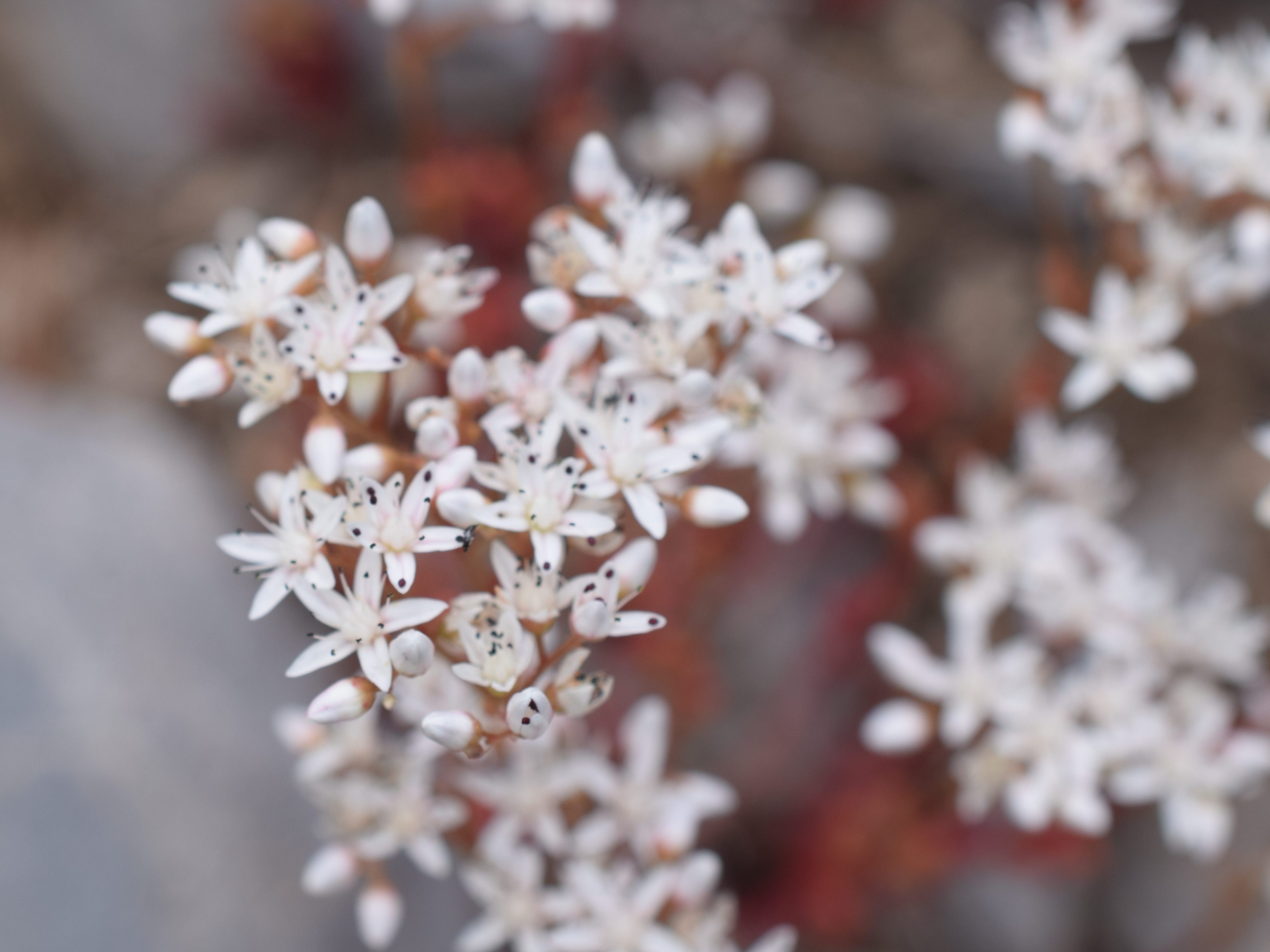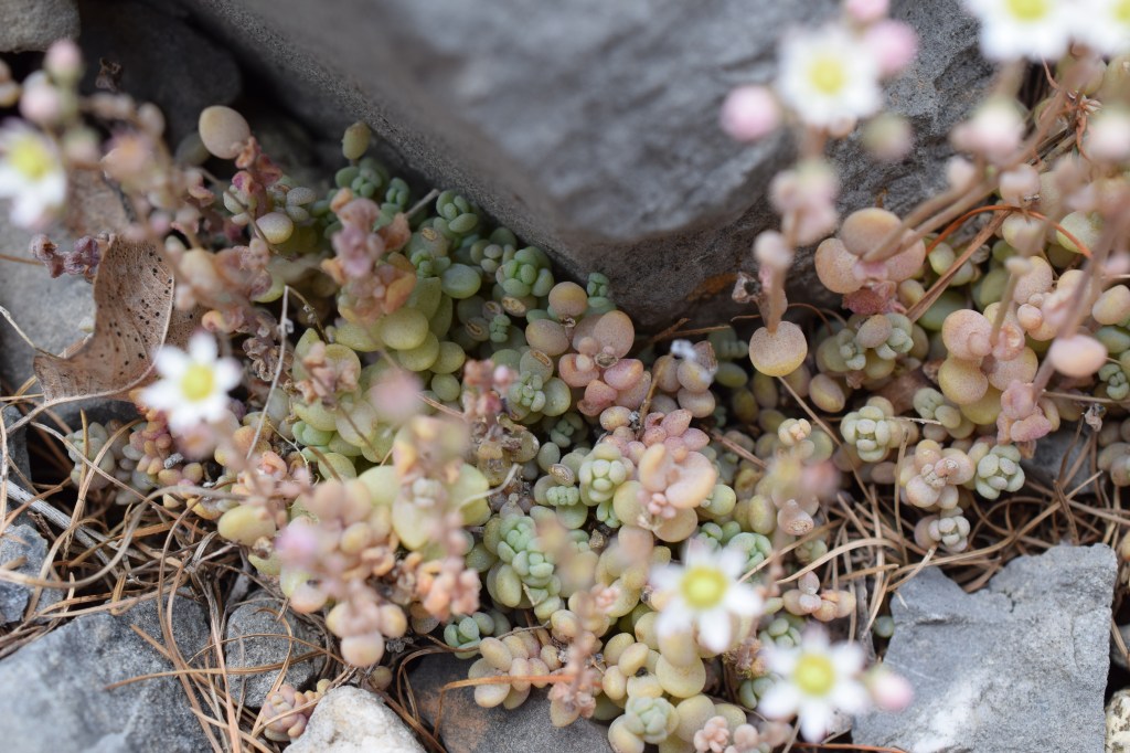 Sedum album, l’orpin blanc, présente de nombreuses fleurs blanches groupées en panicules. La tige et les feuilles présentent souvent une coloration rougeâtre.