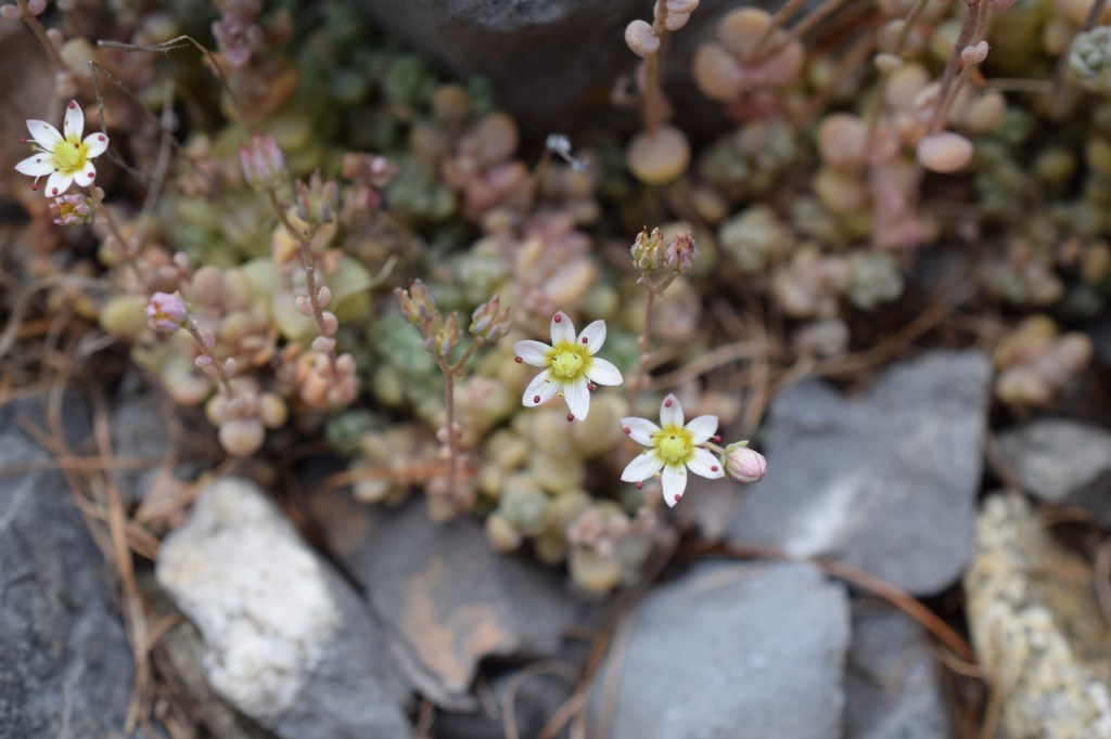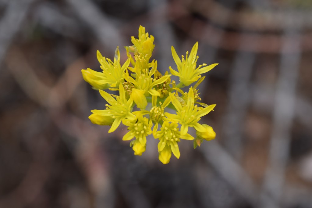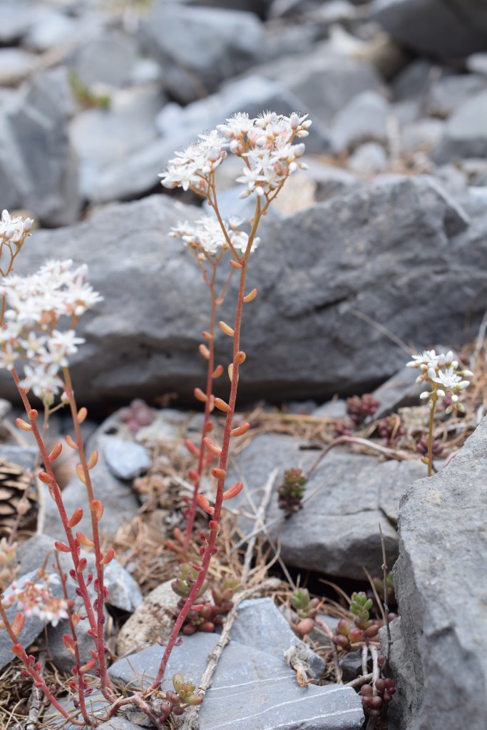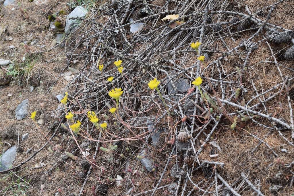 Enfin Sedum sexangulare, l’orpin doux, se distingue par des fleurs jaunes et des feuilles cylindriques, beaucoup plus fines que celles des espèces précédentes. Elles sont desséchées sur les rameaux fleuris mais on les distingue encore sur les rameaux stériles.
