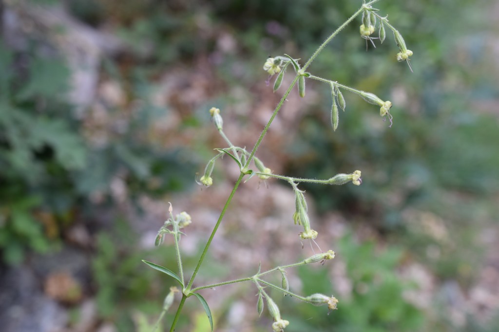 Encore un silene qui ne paie pas de mine, Silene nutans, le silence penché, Caryophyllaceae. Son calice n’est pas renflé à la base, mais tronqué, et couvert d’une pilosité glanduleuse.