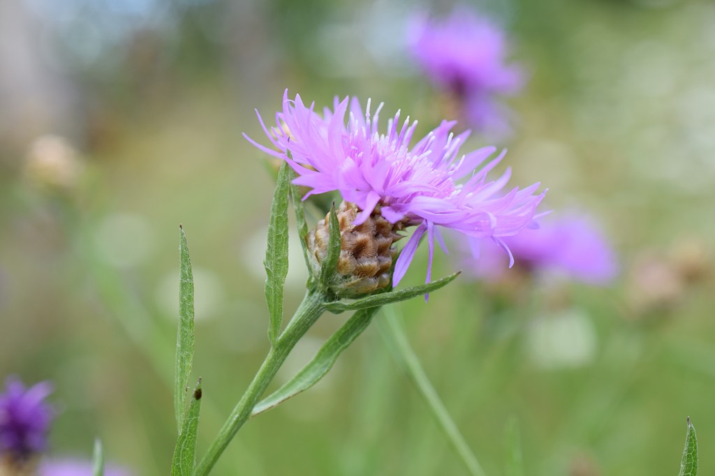 Centaurea jacea, la centaurée jacée, Asteraceae, présente des feuilles caulinaires entières, les feuilles inférieures souvent pennatifides et un involucre à bractées munies d’un appendice frangé.