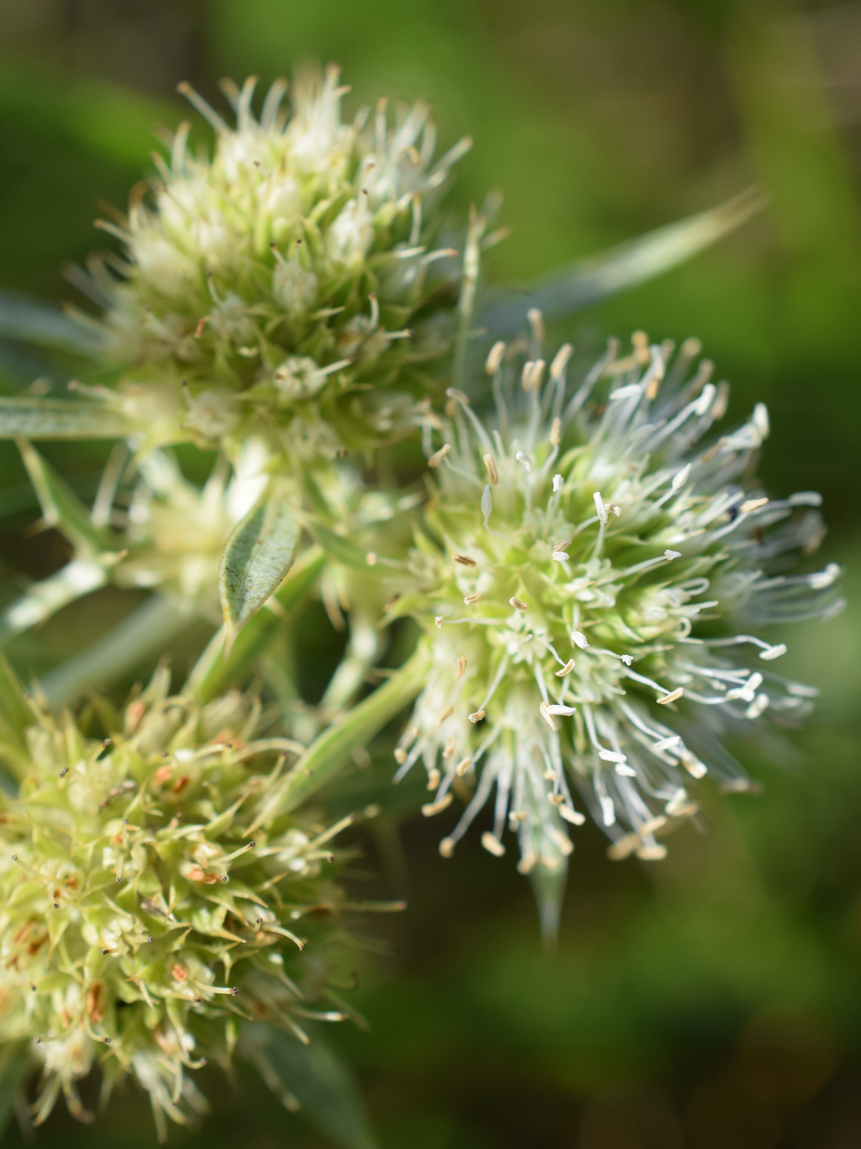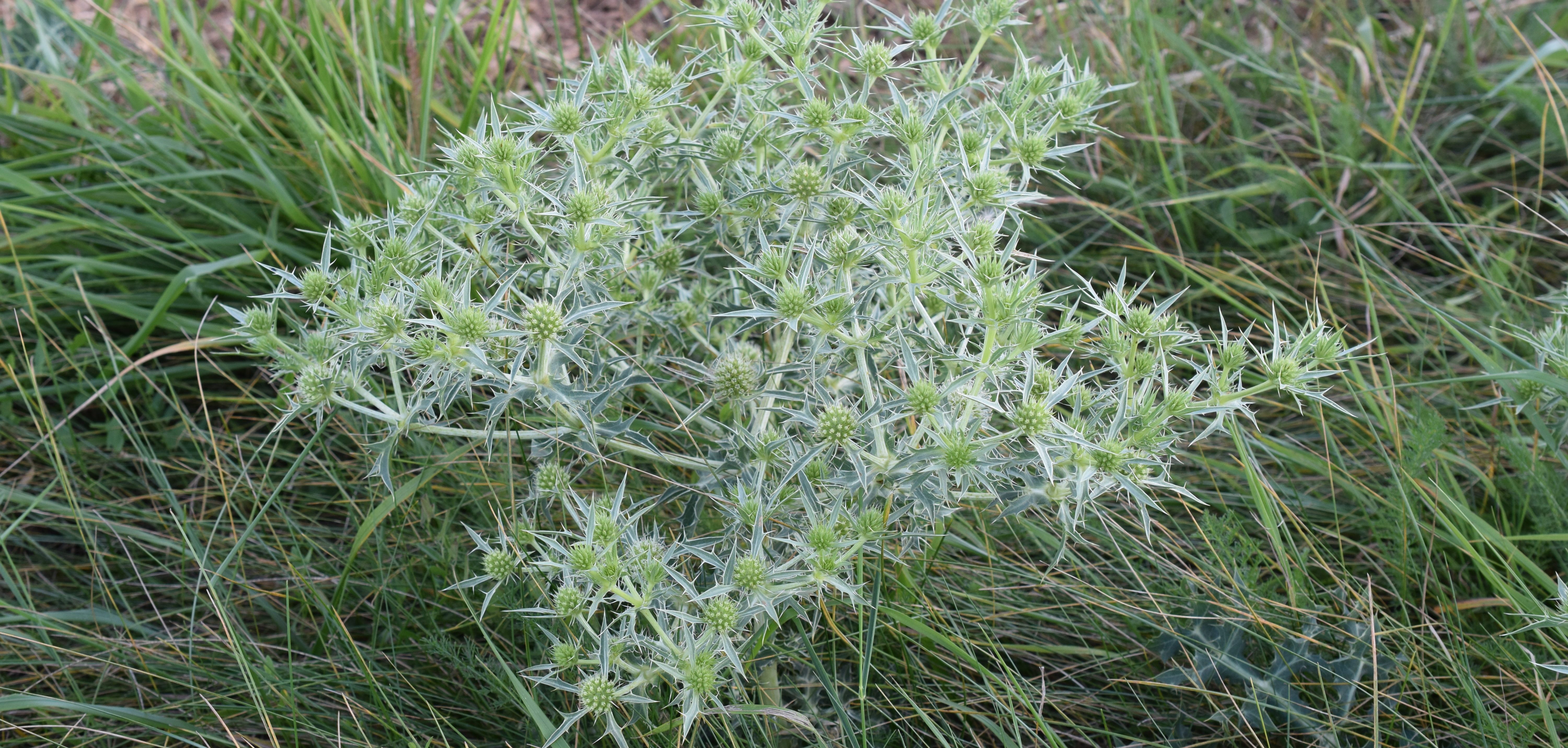Eryngium campestre, le chardon-Roland ou panicaut est aussi une Apiacée. C’est un robuste chardon à port en boule, d’une couleur gris bleu. Les feuilles dont découpées et munies de robustes épines. Les fleurs sont groupées en tête sphériques bardées également d’épines. L’ensemble est bien prévu pour décourager les ruminants.