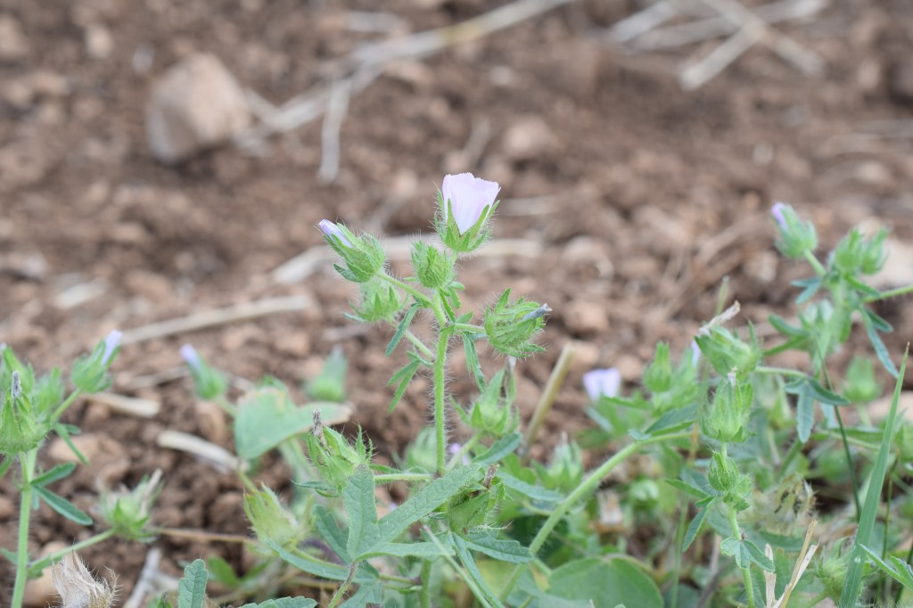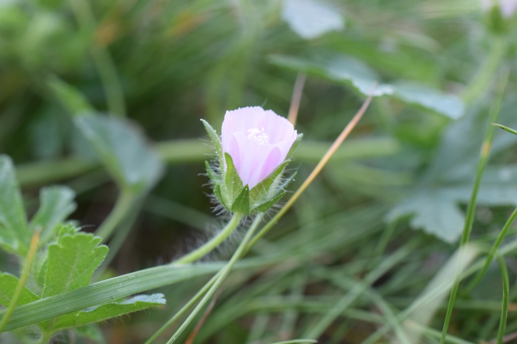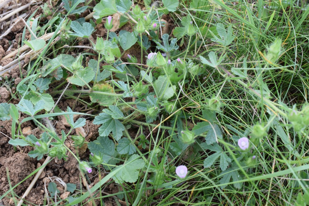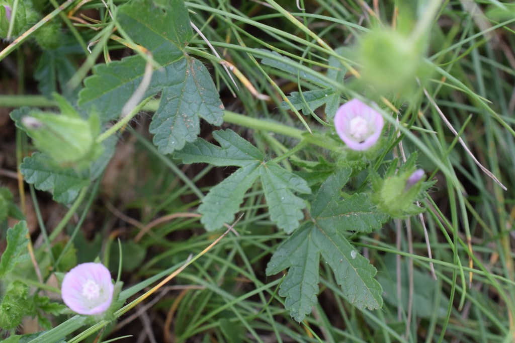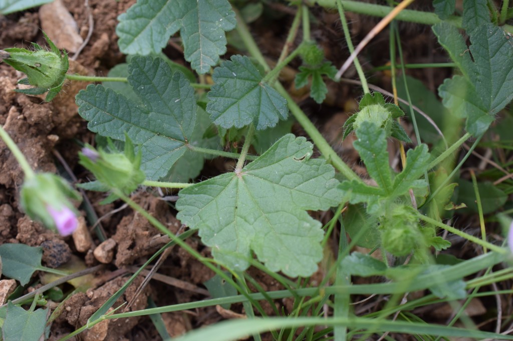 Malva setigera (Althaea hirsuta dans la flore de Coste), la guimauve hirsute, Malvaceae, est une petite mauve à port couché ascendant, à fleurs roses tendre, dont les pétales dépassent peu le calice, celui-ci muni d’un calicule plus court, tout hérissée de poils raides. Les feuilles inférieures sont arrondies, les supérieures palmatiséquées.