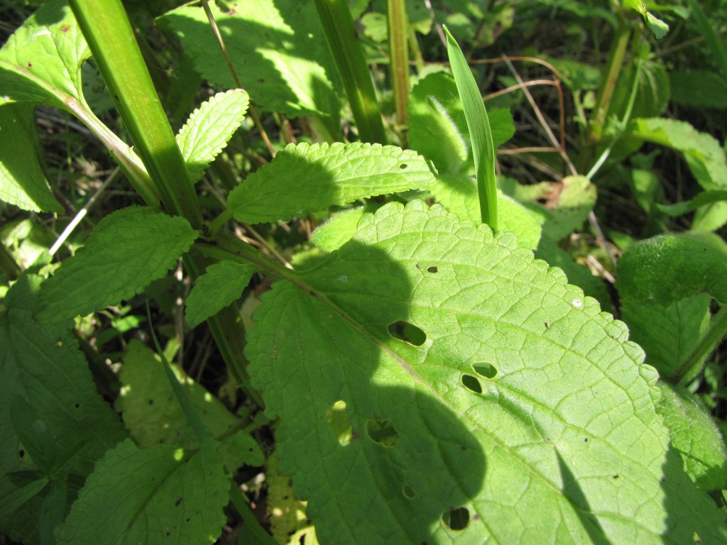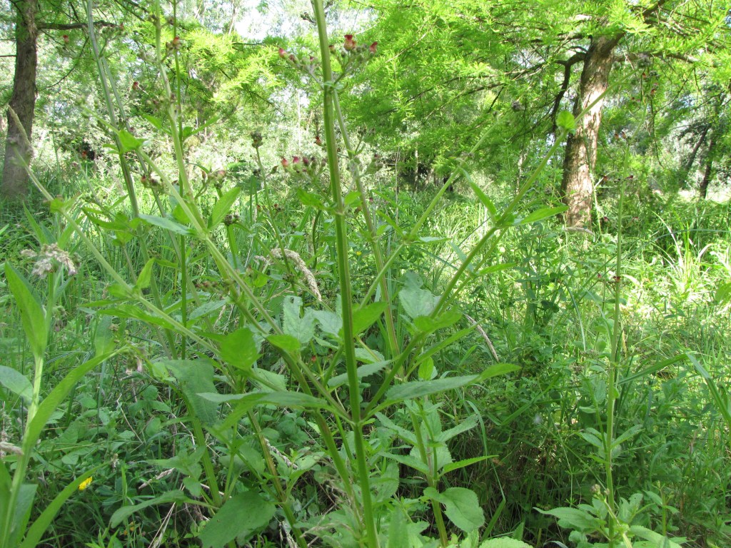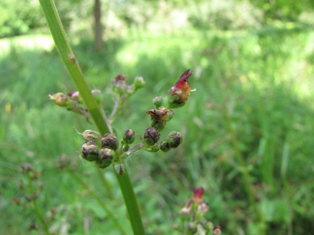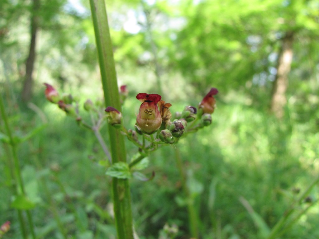 J’aime bien les scrophulaires, je trouve leurs fleurs surprenantes, on les reconnait facilement quand on les a vues une fois. Le genre Scrophularia a survécu à l’explosion des Scrophulariacées, c’est la moindre des choses! Scrophularia auriculata, la scrofulaire aquatique, Scrophulariaceae.