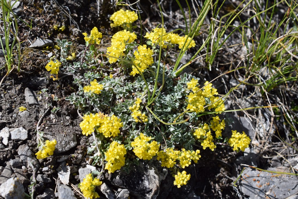 Cette jolie Brassicacée est Alyssum alpestre, l’alysson alpestre. Ses feuilles sont couvertes de poils étoilés qui leur donnent une teinte blanchâtre. Les fleurs sont d’un beau jaune d’or.