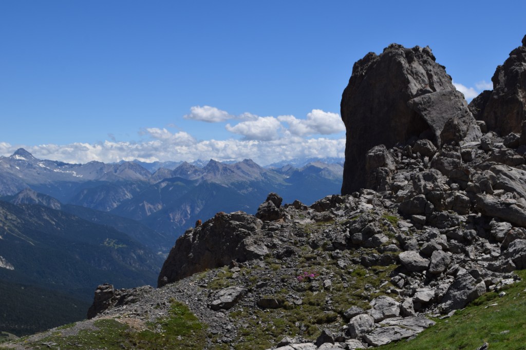 Pendant que mes amies aux pieds légers de jeunes chamois cavalaient dans la montagne, je me suis régalée le nez dans les fleurs. Voici donc la moisson du jour, en commençant par l’étage le plus haut, puis en redescendant jusqu’au point de départ, avec au passage quelques incursions dans la faune. On est sur un substrat calcaire, et pour l’altitude, entre 2700 (au début) et 2200 mètres.