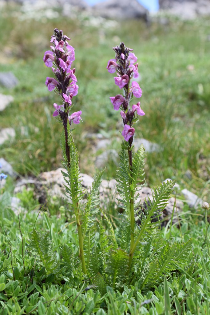 Un peu plus bas, voici la deuxième pédiculaire du jour, Pedicularis rostratospicata, Orobanchaceae, la pédiculaire à bec en épis (!). Belle plante qui rappelle une orchidée mais est une Orobanchacée, famille de plantes hémiparasites.