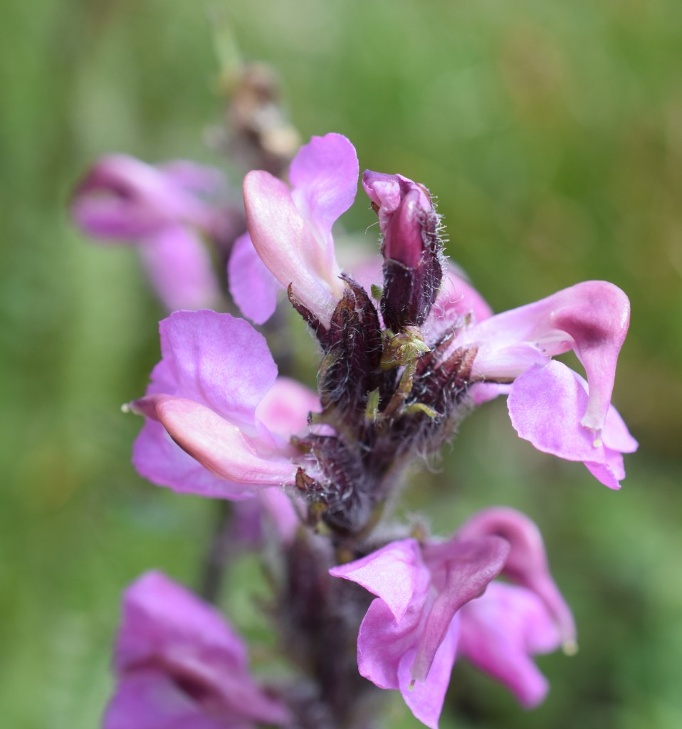 J’adore les pédiculaires avec leurs grappes de fleurs un peu folles. Celle-ci, avec son capitule à poils laineux, est la pédiculaire d’Allioni, Pedicularis rosea subsp. allionii, Orobanchaceae. C’est une plante semi-parasite comme la plupart des Orobanchaceae.