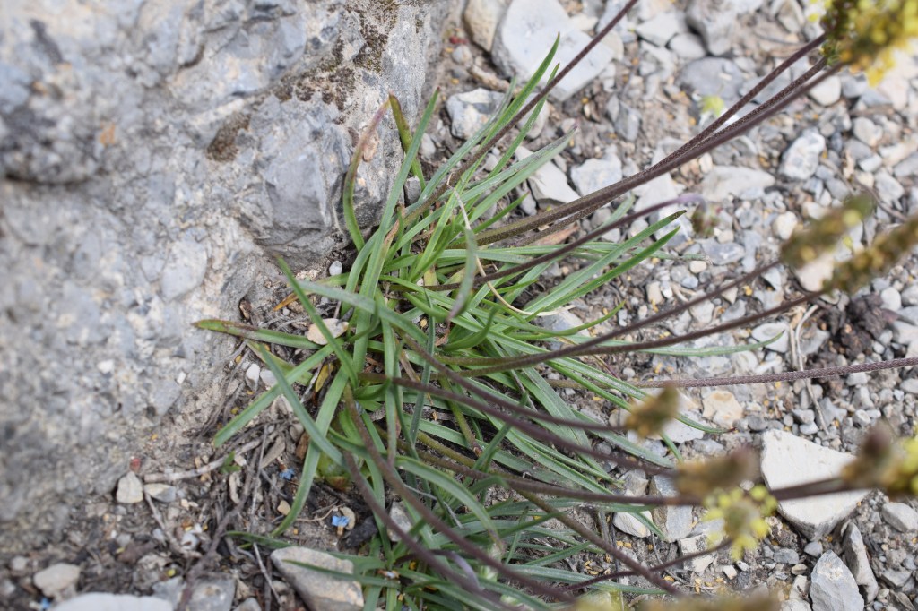 Au pied de l’inule, on voit les petits épis du plantain des Alpes, Plantago alpina, Plantaginaceae.