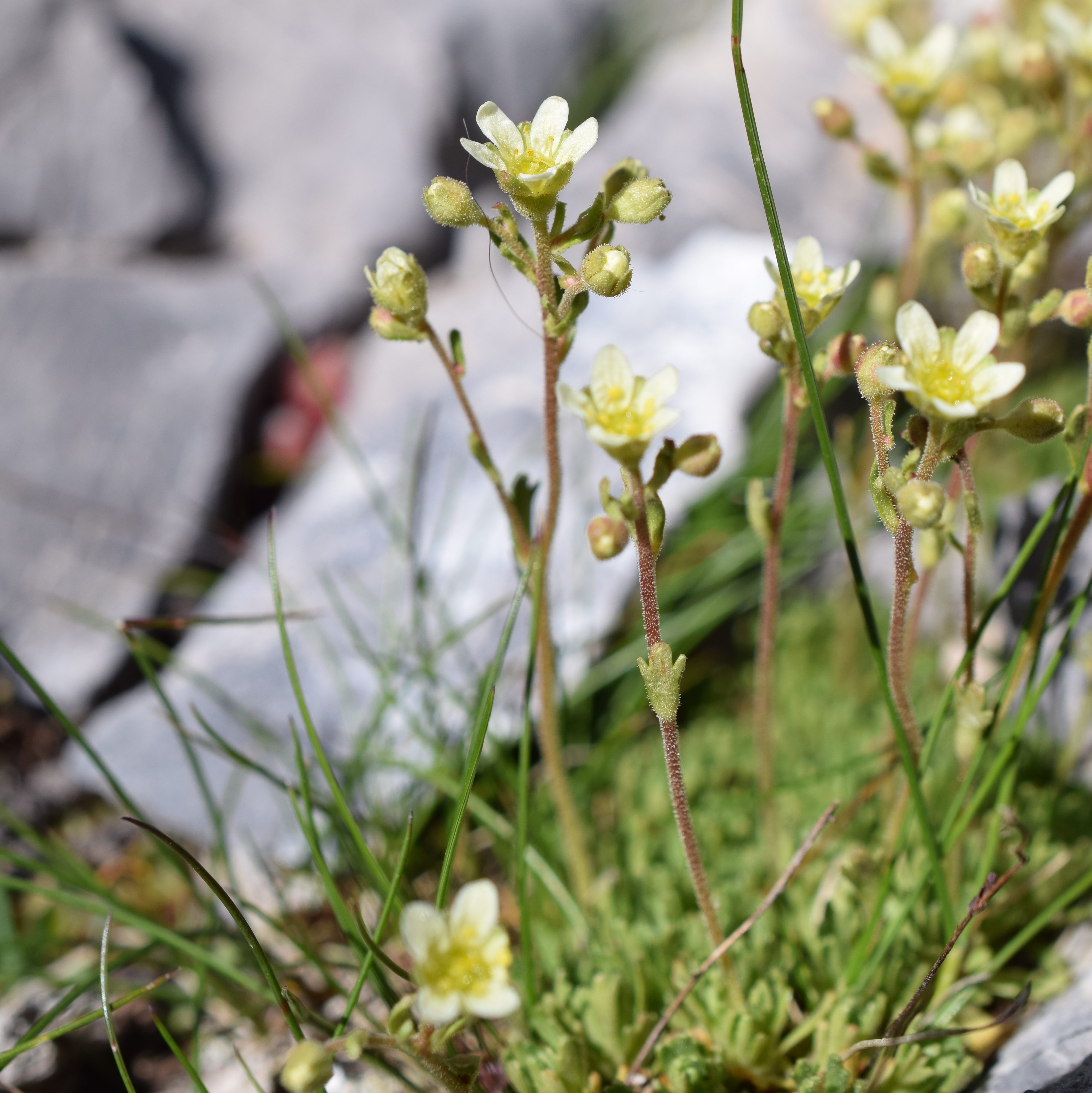 Encore une plante des rochers, la Saxifrage, du latin Saxum, rocher et frangere, casser. Ici Saxifraga exarata, la Saxifrage sillonnée, ainsi nommée parce que les nervures des feuilles forment des sillons bien visibles à la surface. Bon ici sur la photo ce n’est pas vraiment flagrant. Du coup ce pourrait aussi être Saxifraga moschata, rencontrée plus loin. Famille des Saxifragaceae.