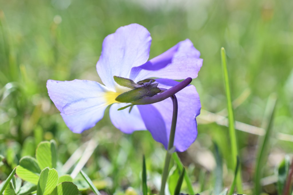 Viola calcarata subsp. calcarata, Violaceae, la pensée des Alpes, a des feuilles en rosette à la base, une corolle d’un beau mauve striée à la gorge. Cette famille est un des rares cas où le langage vernaculaire, qui distingue pensées et violettes se montre plus précis que le langage scientifique.